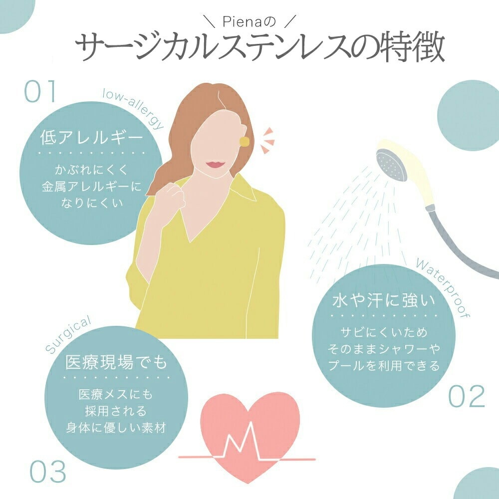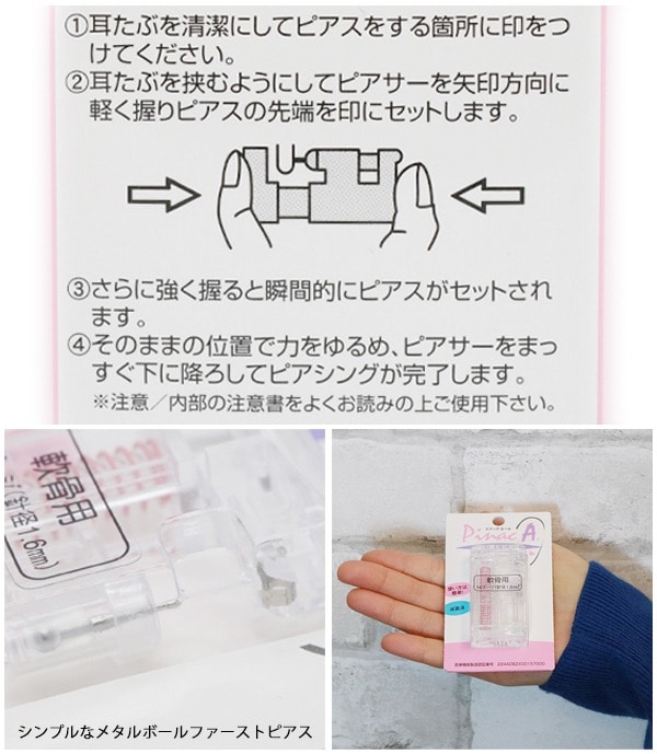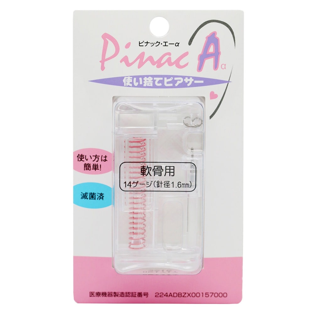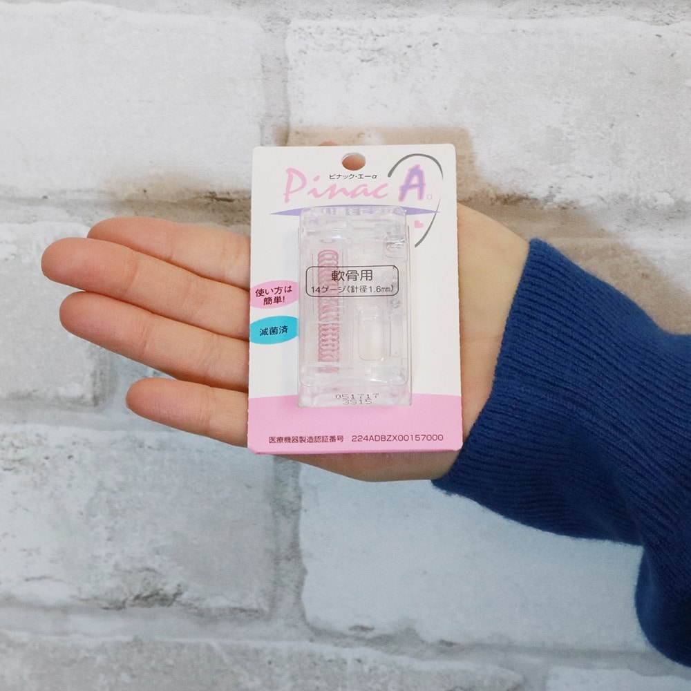 素材 サージカルステンレス316L製 サイズ 軸:長さ約8mm 太さ14G 約1.6mm ボール:直径約3mm バネ発射機構のワンタッチ式軟骨用ピアッサー、ピナックエーです。 使用方法 1 耳たぶを清潔にしてピアスをする箇所に印をつけてください。 2 耳たぶを挟むようにしてピアサーを軽く握りピアスの先端を印にセットします。 3 さらに強く握ると瞬間的にピアスがセットされます。 4 そのままの位置で力をゆるめ、ピアサーをまっすぐ下に降ろしてピアシングが完了します。 EOガスで滅菌されたブリスターパックで無菌状態に包装されているのでとても衛生的です。 使い捨てタイプなので安心してお使い頂けます。 サージカルステンレスは他の金属と比べ傷がつきにくくサビにくいのが特徴。医療用器具にも使用されていますので、金属アレルギーの方にも比較的安心してお使い頂けます。 医療機器製造承認番号 224ADBZX00157000