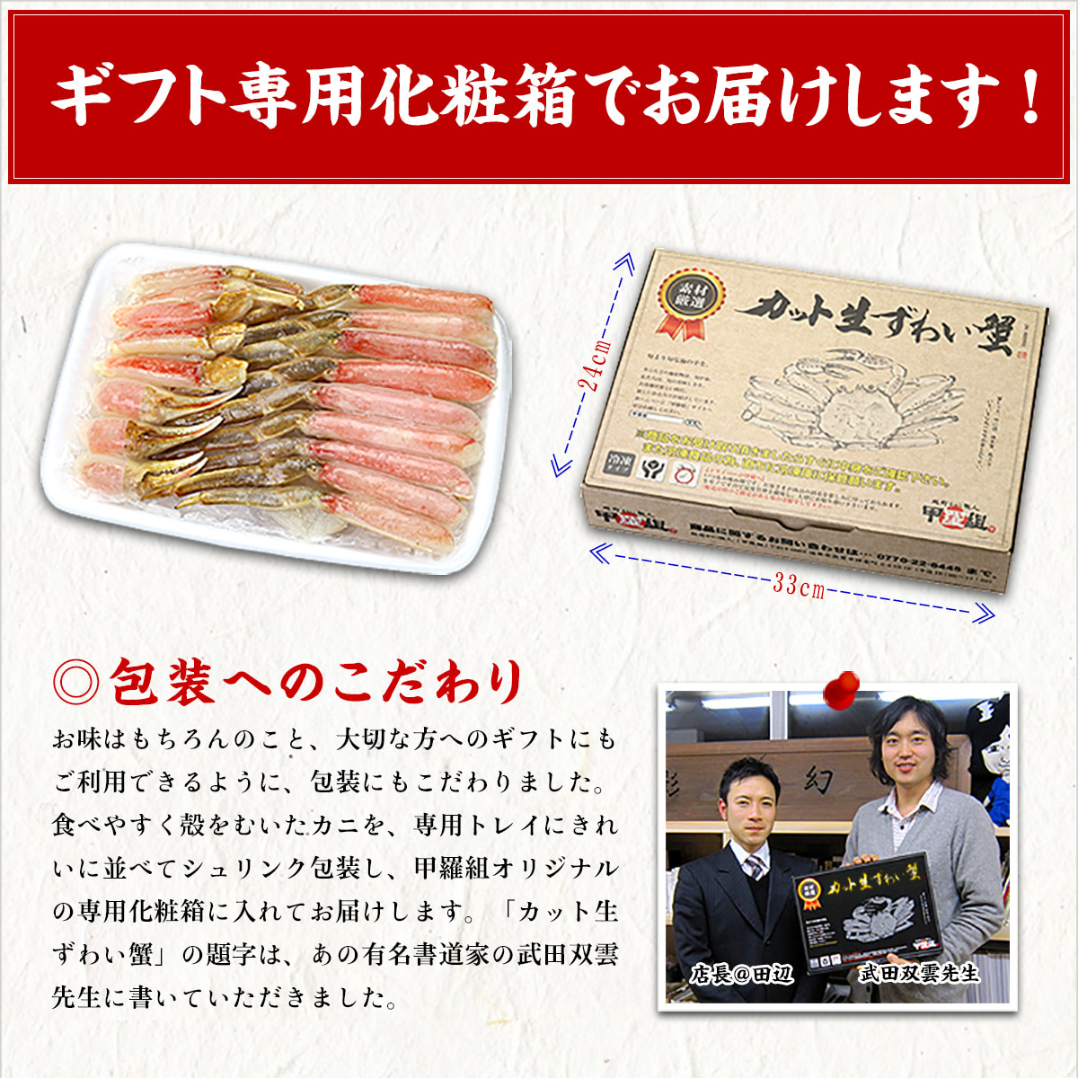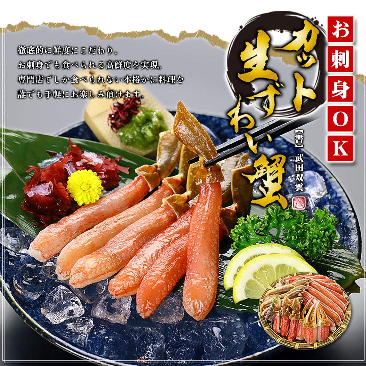 | ★TVのグルメ番組や雑誌のお取り寄せコーナーでの紹介多数! ★お客様満足度90%以上の高評価!絶賛のお声が続々♪ ★カット済みだから包丁や調理バサミ不要で食べやすい! ★お刺身でも食べられる高鮮度!鍋・焼き・しゃぶ…食べ方いろいろ! ★専用化粧箱&食べ方の説明書&のし対応!贈り物にもお薦め! 「カニは好きだけど、食べるのが面倒…」「食べるのに夢中になって、無言になってしまう…」「身の詰まっていない不良品が送られてきそう…」そんなお客様のお声をもとに、この【カット生ずわい蟹】は2011年に開発された商品です。新鮮なズワイガニを厳選し、包丁や調理バサミがなくても簡単に食べられるように、カニの足を1本ずつ職人が丁寧にカットしてお届けしております。販売開始から5年目─、ついにお刺身でも食べられる商品化に成功しました。カニ本来の甘味が繊維の一本一本にぎっしりと詰っていて、まさに「とろける甘さ」が絶品です!カニ刺し、しゃぶしゃぶ、鍋、雑炊、焼きガニ、てんぷら…専門店でしか食べられない本格かに料理のフルコースを、家族みんなで手軽に、存分にお楽しみ頂けると確信しております。 |
