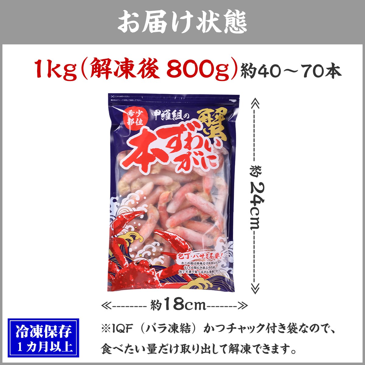 | ボイルずわいがに爪下1kg(解凍後800g)(約40~70本入) 原材料:ズワイガニ(ロシア産)、食塩、調味料(アミノ酸等)、(一部にカニ・大豆を含む) ※ご注文のタイミングにより包装が異なる場合がございます |