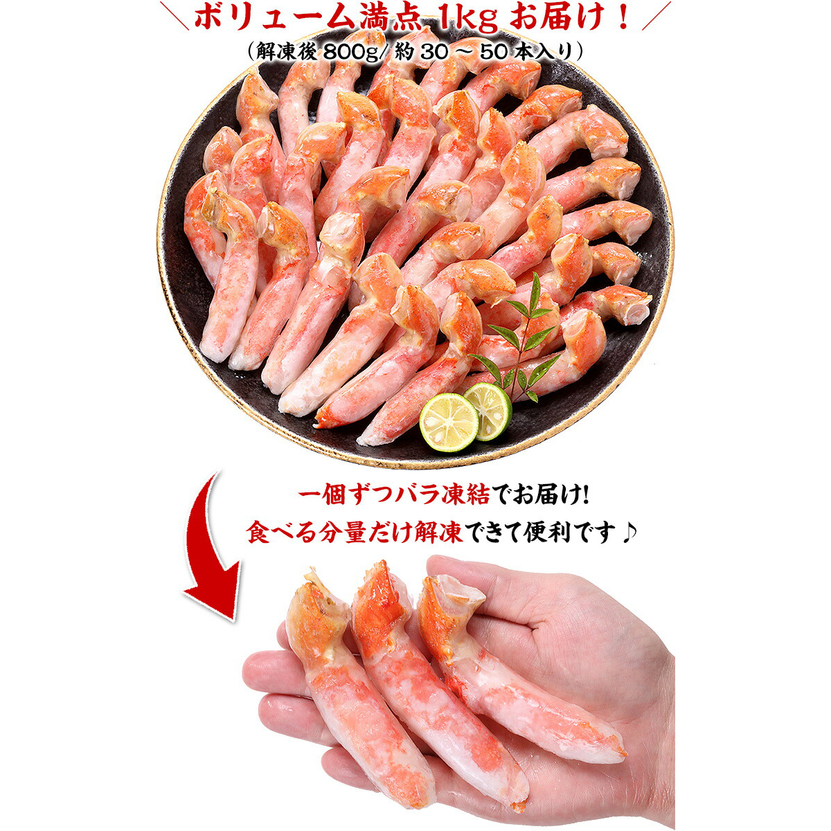 | 1ハイのカニからわずか2本しか取れない希少な部位「爪下」のみを、たっぷり1kg(約40~70本入)本集めたお得なセットが登場です! 「爪下」という部位は、カニの親爪の根元の部分を指し、カニが毎日食事をしたり、カニ同士ケンカをするときに動かす力強い部位ですので、肉がとっても発達していて、プリプリとした食感が特徴です。 そんな希少な「爪下」を新鮮なままボイルし、手作業で殻むきしフルポーションに仕上げました!解凍するだけで食べられるから面倒な作業は一切なし!並べるだけで一皿完成です♪ |