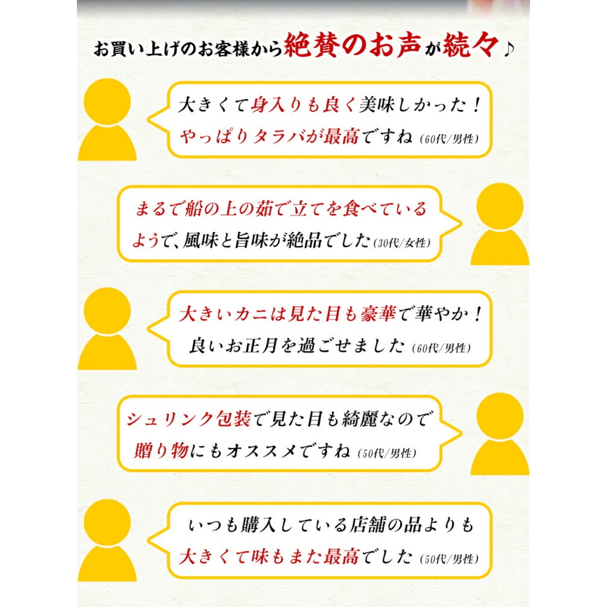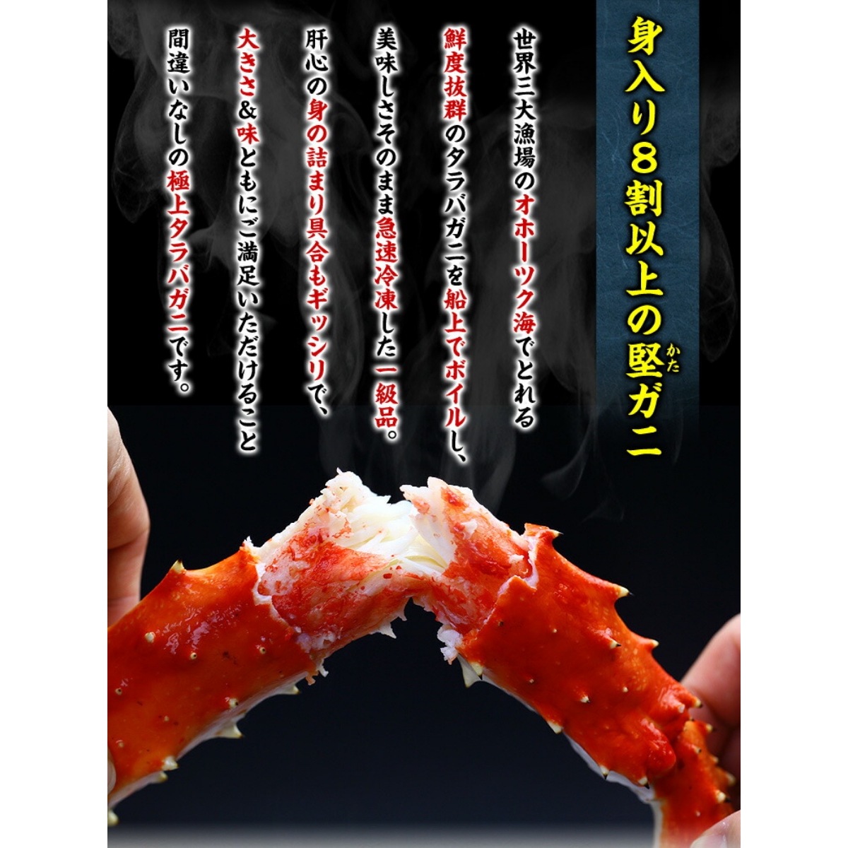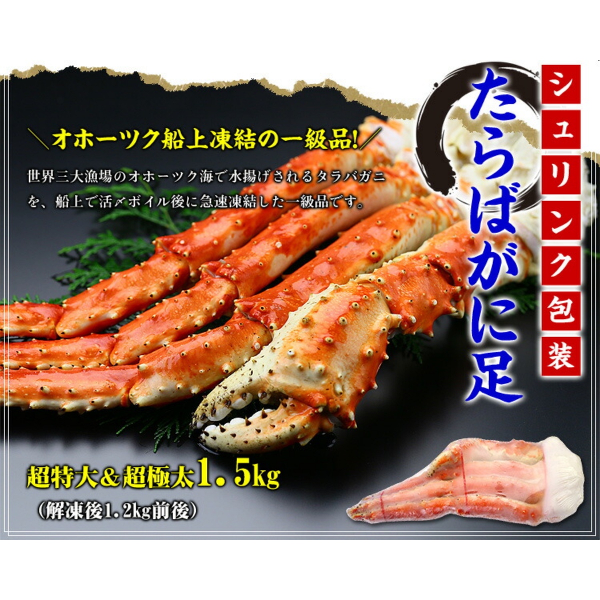 | ◎オホーツク海で水揚げされる身入り抜群のタラバガニ! ◎食べ応え抜群!超特大&超極太1.5kgサイズを厳選! ◎ご贈答にお薦めのきれいなシュリンク包装でお届け! タラバガニの魅力はなんといっても、他のズワイガニや毛ガニとは比べものにならない足の太さです。世界三大漁場のオホーツク海で水揚げ直後に船上で活〆ボイルし、美味しさそのまま急速凍結した一級品です。まるで未冷凍のような身質と食感、そして身離れの良さを実現しました。とても冷凍品とは思えない、活茹での味と殆ど変らない抜群の味にビックリすること間違いなし!大きさといい、味といいタラバガニの魅力を存分に楽しめる逸品です。ご贈答やお友達との忘年会や新年会、そしてご家族の集まりに是非このタラバガニをお試しください! |