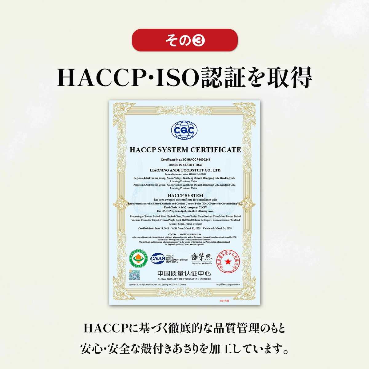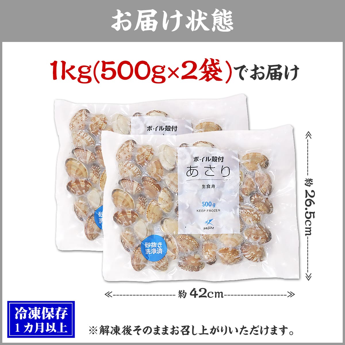 | ◎主婦/主夫の強い味方 便利な殻付きあさり ◎砂抜き済・加熱済で手間いらず♪ ◎高たんぱく&低脂質でとてもヘルシー ◎真空パックで鮮度と旨みをギュッと凝縮 ◎HACCP・ISO認証の工場で加工 砂抜き済・加熱済で解凍するだけで食べられる便利な殻付きあさりです。 HACCP・ISO認証の工場で徹底した衛生管理のもと加工されているため、お子様からお年寄りまで安心。 冷凍することであさりに含まれる「コハク酸」「遊離グルタミン酸」といった旨味成分が出やすくなるため、より強く旨味を感じることが出来ます。 さらにあさりは高たんぱく&低脂質でとってもヘルシー。 血液を作る働きがあるビタミンB12の含有量は貝類の中でトップクラス。 他にも鉄分やカルシウム、亜鉛など、体を支える栄養素を豊富に含んでいる為、健康に気を使っている方にもオススメの食材です。 1kgと大容量なので、あさりの酒蒸しやお味噌汁、パスタなどいろんな食べ方でお楽しみください。 |