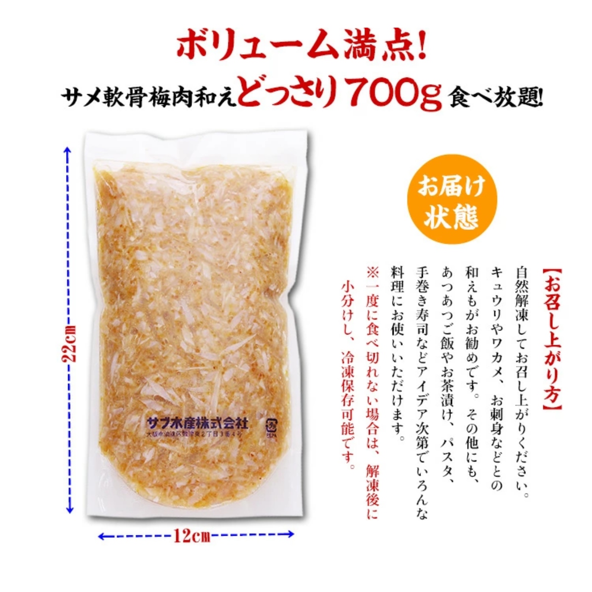 | サメ軟骨梅肉和え(梅水晶ヤゲン軟骨入り)700g <原材料>鶏ヤゲン軟骨(ブラジル又はタイ産)、梅肉、サメ軟骨、飛魚卵、かつお節調味液、上白糖、醸造酢、たん白加水分解物、食塩、発酵調味料、調味料(アミノ酸等)、酢酸Na、加工澱粉、増粘剤(ペクチン)、酸化防止剤(VC)、着色料(アントシアニン、アナトー、ラック)、酒精、ナイアシン、VB1、香料 |