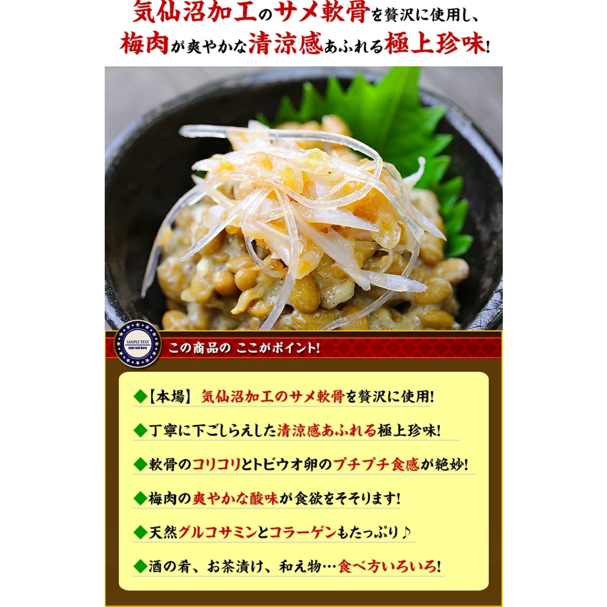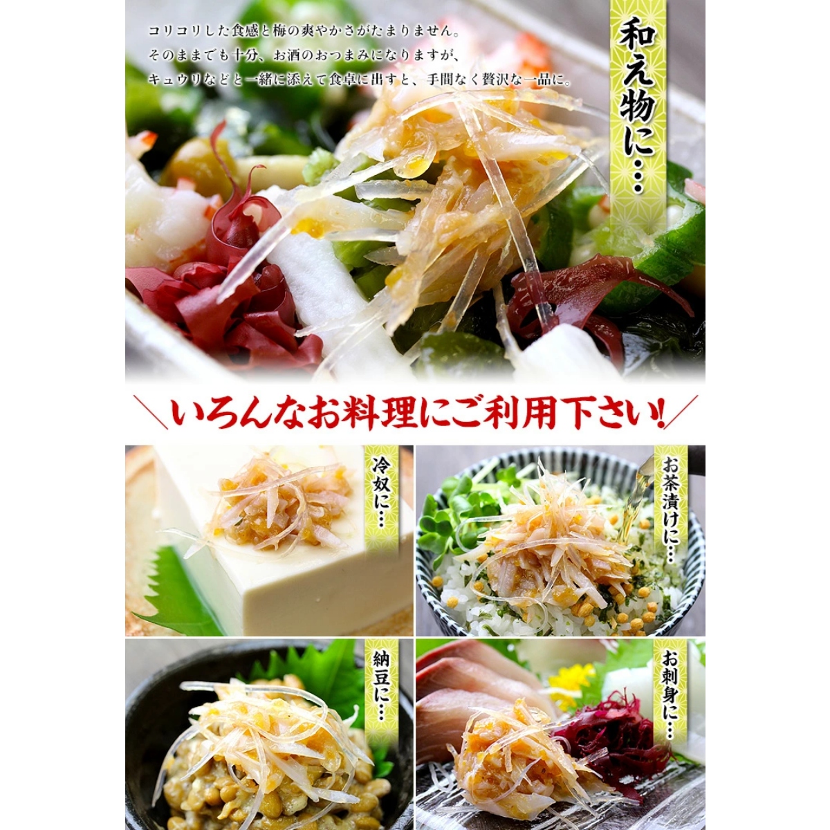 | 軟骨のコリコリ食感と、トビウオ卵のプチプチ食感、そして、甘すぎず酸っぱすぎず、まろやかな酸味の梅肉、それぞれが引き立て合い、まさに芸術レベル。酒飲みの琴線に響く極上珍味です。そのまま酒の肴としてつまんでも美味しいですし、イカの細切りやワカメ、キュウリなどと一緒に和えたりしてもGOOD!また、あつあつご飯や酢飯とも相性も抜群なので、お酒を飲まない方やお子様にも大好評のオールラウンドプレイヤーです。さらに、軟骨には天然グルコサミンやコンドロイチン、コラーゲンもたっぷり含まれているので、健康に気を遣われているご年配の方にもお勧めです。美味しい天然サプリメントで健康的な食生活を! |