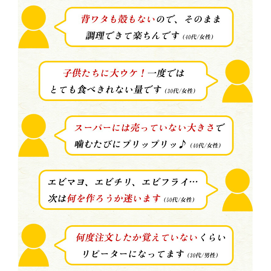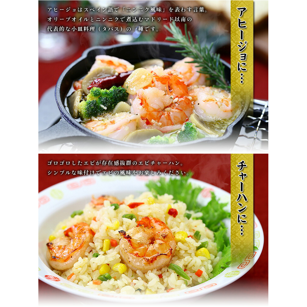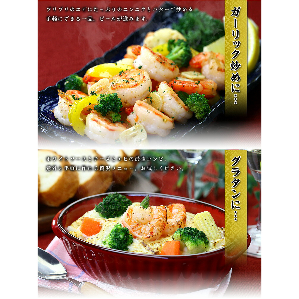 ブラックタイガーの特徴は、身質がしっかりしていて歯ごたえ、食感が良く、加熱した時の鮮やかな赤色の発色が食欲をそそります。類似品の安価なバナメイエビと食べ比べてみると、その違いは一目瞭然です。今回は新鮮な活原料を1尾ずつ丁寧に殻をむき、背中に切れ目を入れて背ワタを取る「バタフライカット」と呼ばれる特殊加工をしてありますので下ごしらえ不要で調理が簡単です。素材にこだわりそんなプロ仕様の一級品ブラックタイガーの中から、食べ応え抜群の特大サイズを厳選し、頭と尾を取って殻をむいて、しかも面倒な背ワタまで取り除きました。また、1尾ずつバラ凍結されており、使いたい分だけ解凍できますので、下処理なしですぐに調理できる優れものです。エビマヨ、エビチリ、エビフライ、野菜炒め…ボリューム満点たっぷり1キロのお得な業務用パックでお届けしますので、ご家庭でいろんなエビ料理を存分にお楽しみください。