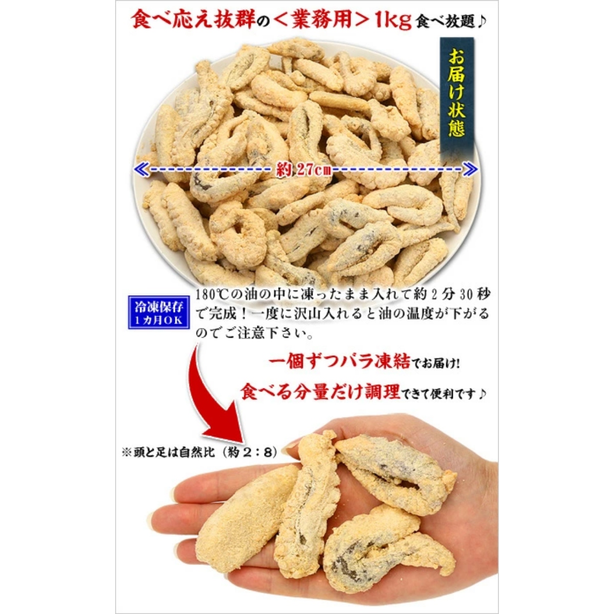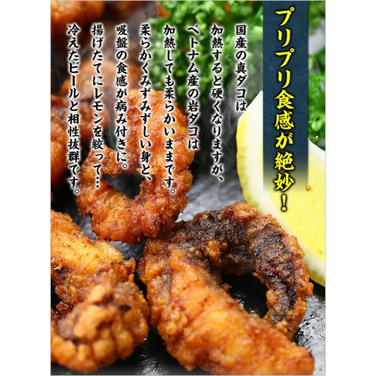 | たこ唐揚げ1kg <原材料名>タコ(ベトナム)、衣(小麦粉、でん粉、ぶどう糖、食塩、脱脂粉乳、粉飴、卵白粉末、粉末しょうゆ、香辛料)、加工でん粉、調味料(アミノ酸等)、着色料(カロチノイド)原材料の一部に小麦、大豆、乳、卵を含む |