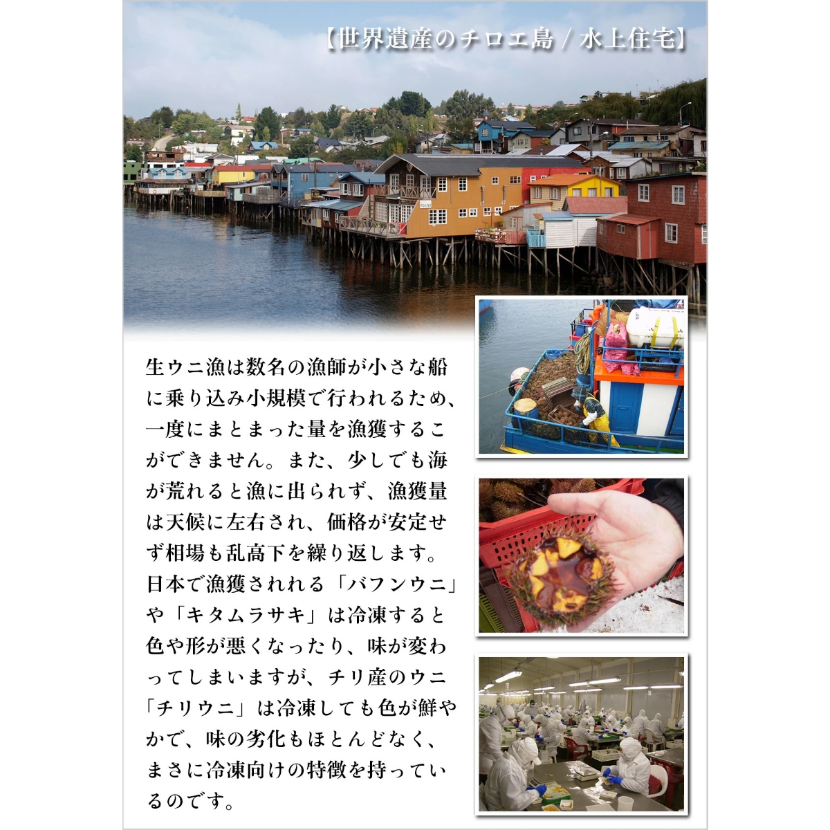 | ◎チリ産の新鮮な天然うにを厳選! ◎ミョウバンを使わない完全無添加の特殊製法 ◎自然解凍するだけで濃厚なうにをお手軽に! ◎海鮮丼、手巻き寿司、パスタ、グラタン…食べ方いろいろ! ここ数年、凍結技術の進歩は目を見張るものがあります。解凍時のドリップが少ない魔法の凍結技術と言われるCAS(キャス)凍結が登場し、今までの「冷凍刺身はマズイ」という常識が薄れつつあります。しかし、マグロなどと違って、うには最新の冷凍技術をもってしても、解凍時のドリップ、身くずれが発生し、生の美味しさが保てません。う~む、、なんとかして冷凍の美味しいうにを販売したい!そんな思いのもと全国を探し回った結果、地球の反対側にあるチリ共和国で、無添加の冷凍うにが製造できるという情報をつかみました。正直、北海道の高級バフンウニと比べると濃厚さは劣りますが、冷凍保存で手軽に食べれて、しかも低価格ということを考慮すると、とても満足度の高い一品だと思います。 |
