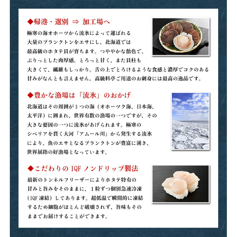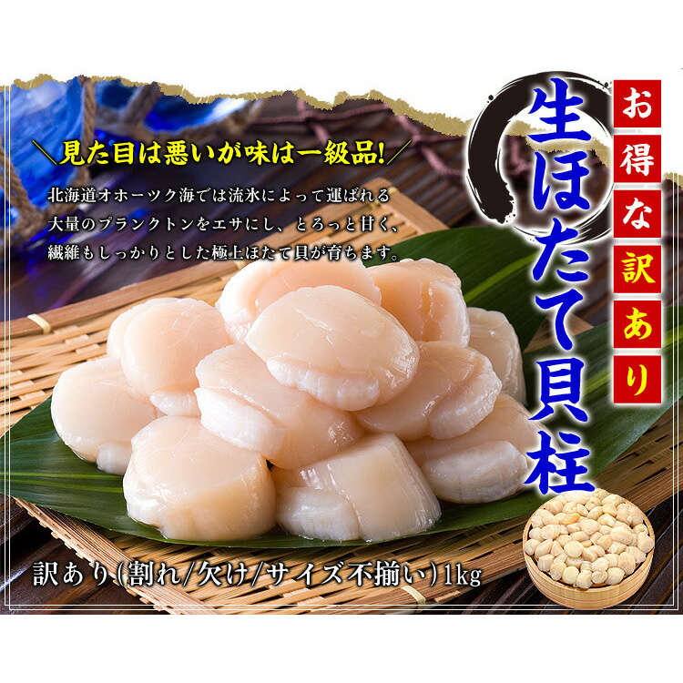 | 商品内容 | ほたて貝柱(生/冷凍)1kg(割れ、大小バラツキあり) |