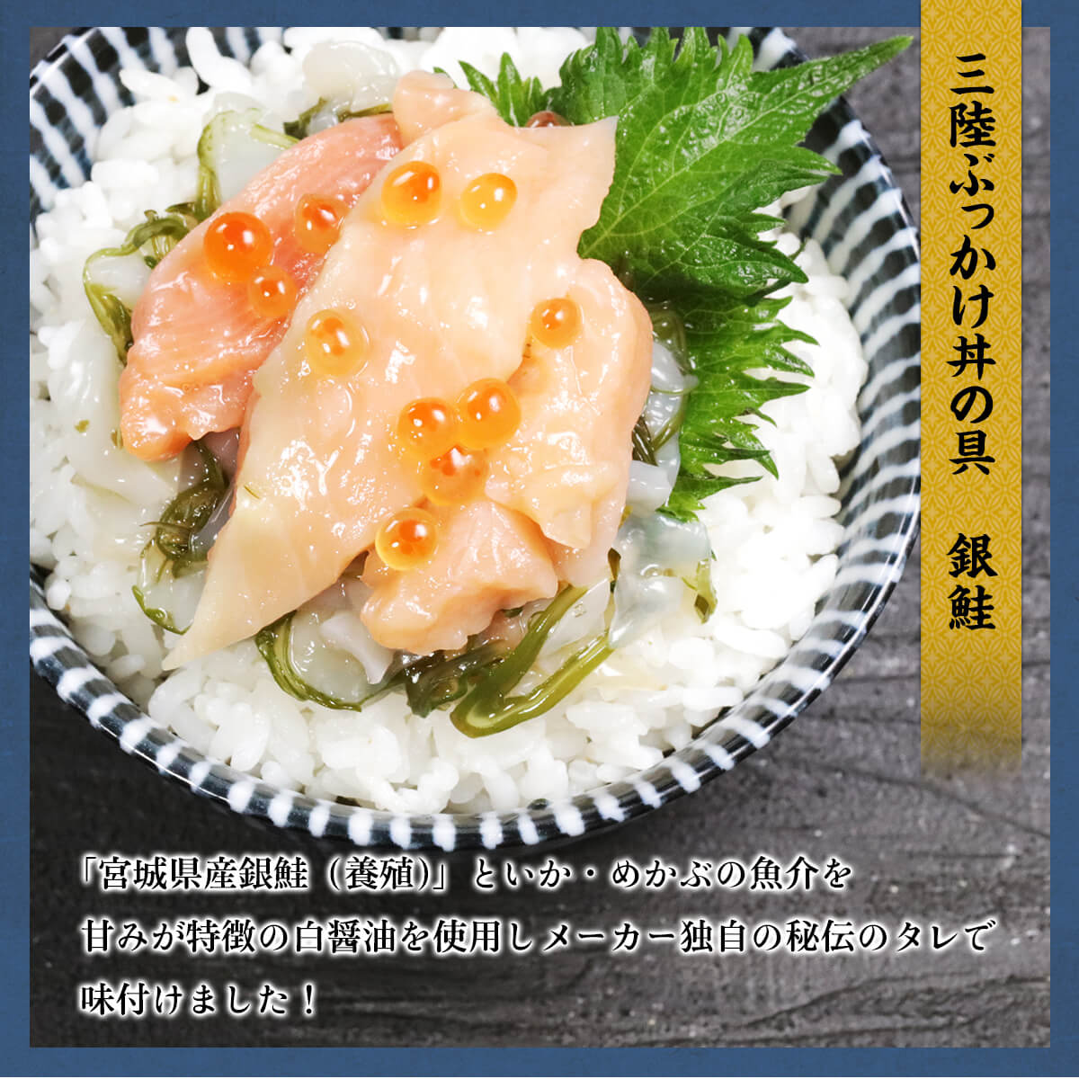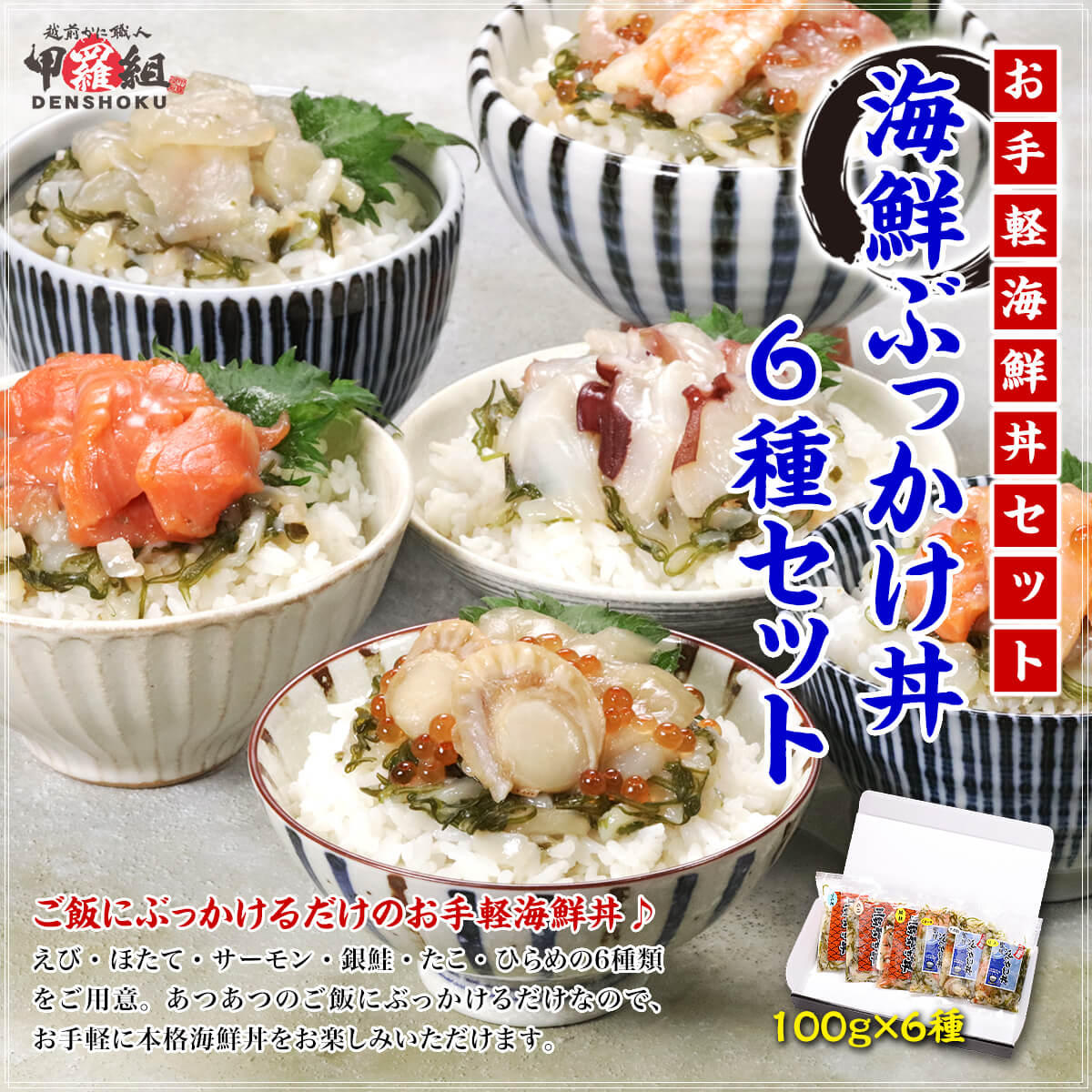 簡単・便利♪解凍して温かいご飯に掛けるだけで簡単に本格的な海鮮丼がお楽しみ頂けます。 人気の食材の3種(ほたて、えび、サーモン)と、三陸産の原料にこだわった3種(銀鮭・ひらめ・たこ)の合計6種。 イカ・メカブ・ツブいくらの魚介類をベースに、甘みが特徴の白醤油を使用したメーカー独自の秘伝タレで味付けしました! お子様からご年配の方まで幅広い方々に喜んでお召し上がりいただける商品となっております。 |