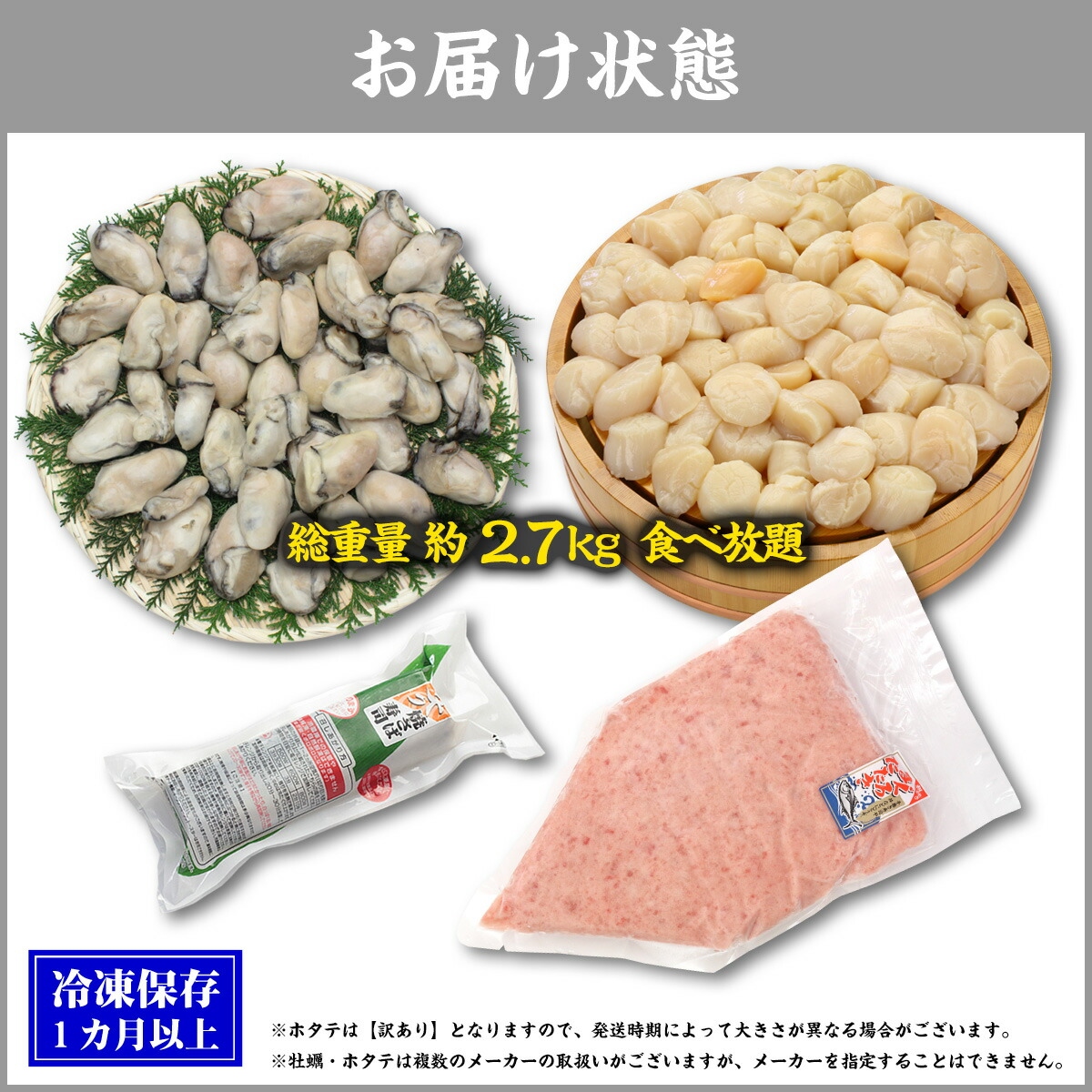 | お召し上がり方 | 【牡蠣】 食べる直前に使う分だけ取り出し、流水解凍してください。※加熱用なので食中毒予防のため、身の中心温度は85℃で1分以上加熱すること。 ※加熱解凍・自然解凍は品質が損なわれますのでご遠慮ください。 【生ほたて】 この商品は、鮮度を保つため急速冷凍してお届け致します。冷蔵庫で半日ほどかけてじっくりと自然解凍がお薦めですが、お急ぎの場合は流水にて急速解凍してお召し上がり下さい。 【ネギトロ】 冷蔵庫に移し、1日かけてじっくり自然解凍して下さい。小分けにする場合は、凍っている状態のまま袋から出し包丁で切り分けて下さい。残りはラップで1枚ずつ包み、ジップロックなどに入れ冷凍保存しておくと便利です。 ※電子レンジで解凍したり、一度解凍したものを再冷凍すると風味が落ちます。※ネギトロは冷凍庫で保存していても品質劣化しやすい性質を持っていますのでご注意ください。 【鯖寿司】 凍ったまま電子レンジで3分ほど加熱します。その後、20分ほど放置して余熱で蒸してからお召し上がりください。 |