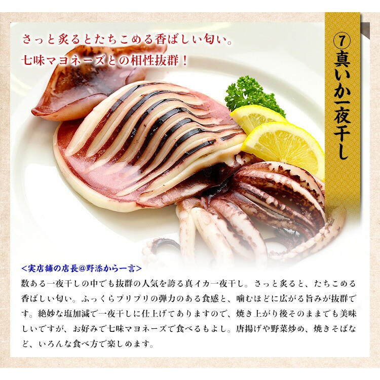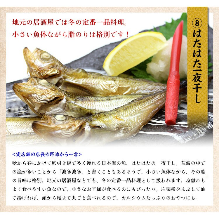| (1)きんき一夜干し(中サイズ)×1尾 アメリカ産 (2)のどぐろ開き一夜干し(中サイズ)×1尾 日本海産 (3)金目鯛開き一夜干し(中サイズ)×1尾 国産 (4)縞ホッケ開き一夜干し(特大サイズ)×1枚 アメリカ産 (5)とろサバ開き一夜干し(大サイズ)×1尾 ノルウェイ産、もしくは国産 (6)赤カレイ(中サイズ)×1尾 日本海産 (7)真いか×1枚 北日本近海産 (8)ハタハタ×3~5尾 日本海産 |
