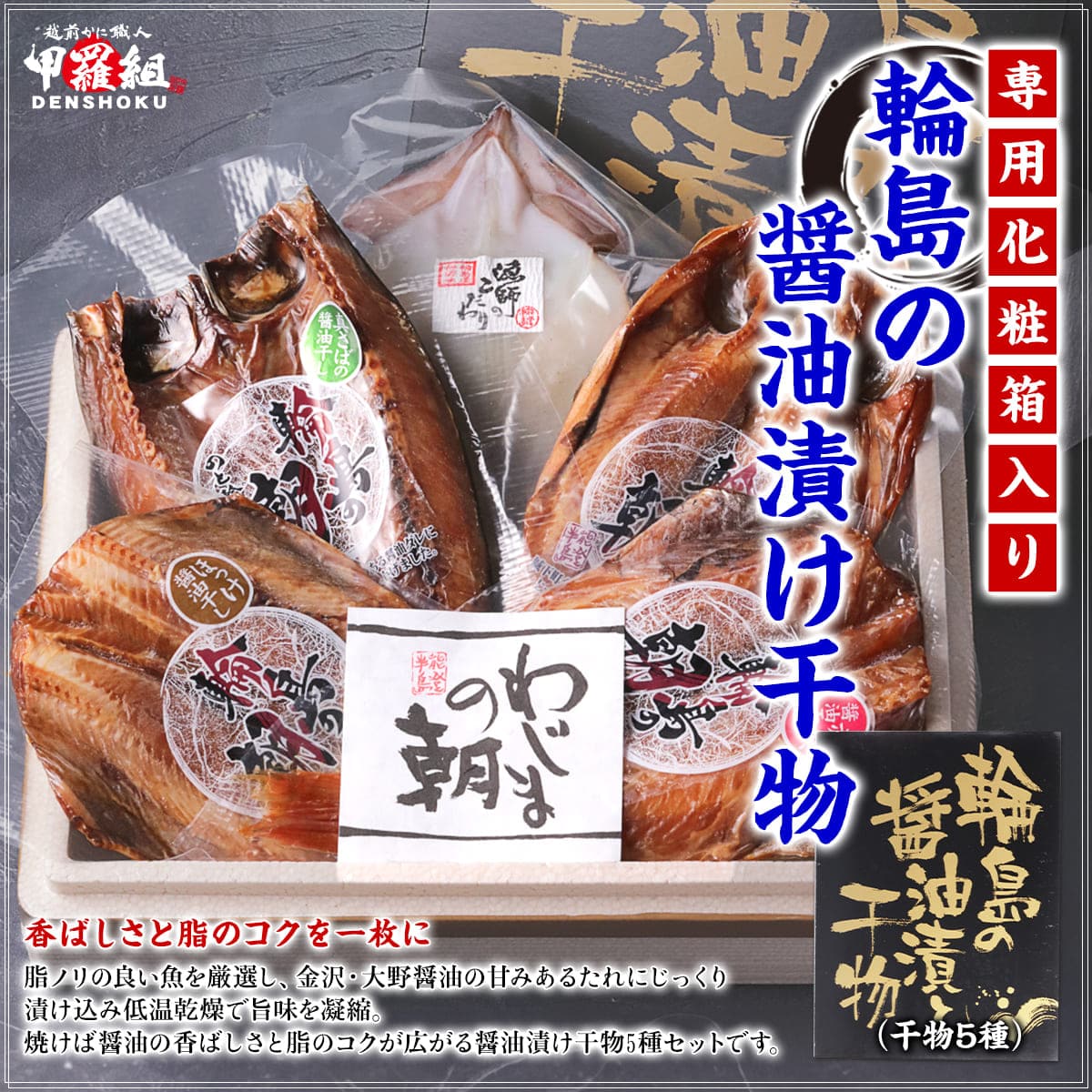 輪島の醤油漬け干物5種セット (縞ほっけ/さば/赤魚/真ほっけ/いか) ほっけ さば あかうお いか イカ 干物 セット 醤油干し いしる干し 輪島 冷凍 化粧箱 ギフト 甲羅組
