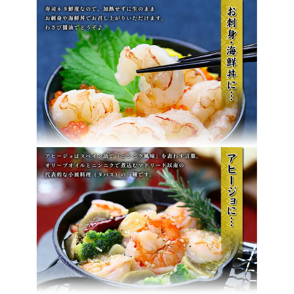 | 食べる直前に流水で急速解凍し、まずはお刺身でお召し上がり下さい。さび醤油でエビの甘さと、とろけるような食感を十分にご堪能頂けます。お刺身の他にも、カルパッチョやエビマヨ、エビフライなどいろんなお料理にご利用頂けます。 |