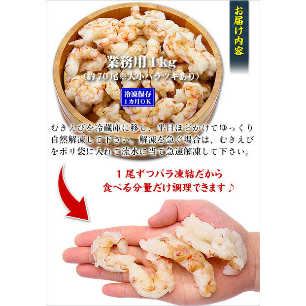 お刺身でも食べられる高鮮度の希少な天然ムキエビの訳あり品が限定入荷!どんな訳ありかと言いますと、寿司ネタ用の赤エビの開き処理をする過程で加工ミスや、形の悪いモノを集めた訳あり品です。ただ、見た目は悪いですが寿司ネタ鮮度なのでお味は抜群!大小バラツキもあるため大特価でご奉仕いたします!殻むきと背ワタ取りの面倒な下ごしらえ不要で、解凍するだけでお刺身やカルパッチョ、エビマヨ、エビフライ…いろんな食べ方でお楽しみ頂けます!業務用たっぷり1kgの大ボリュームで食べ応えも抜群! 冷凍庫にストックしておくと、とても重宝する一品です。 |