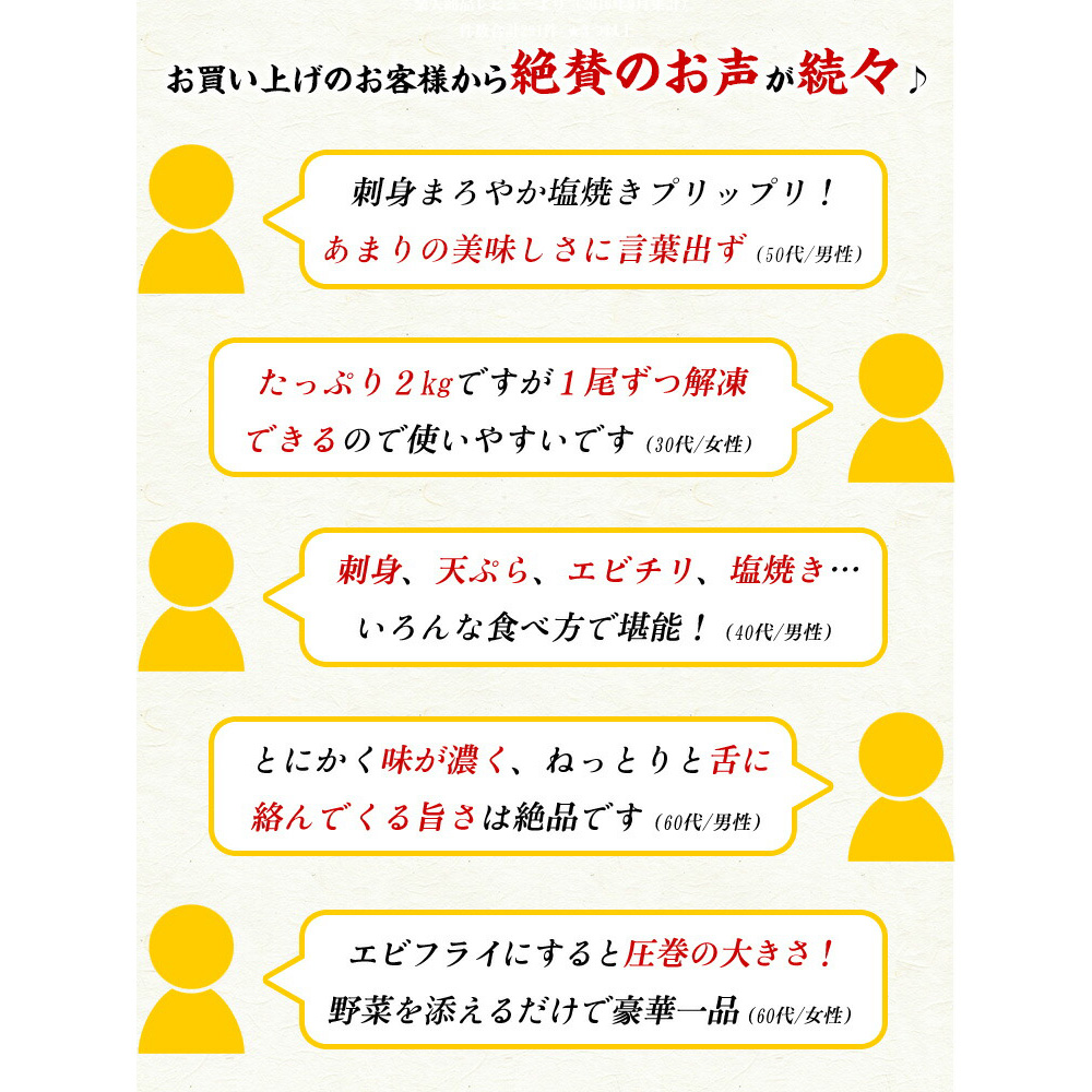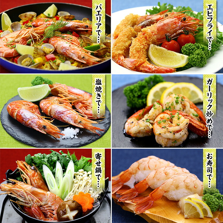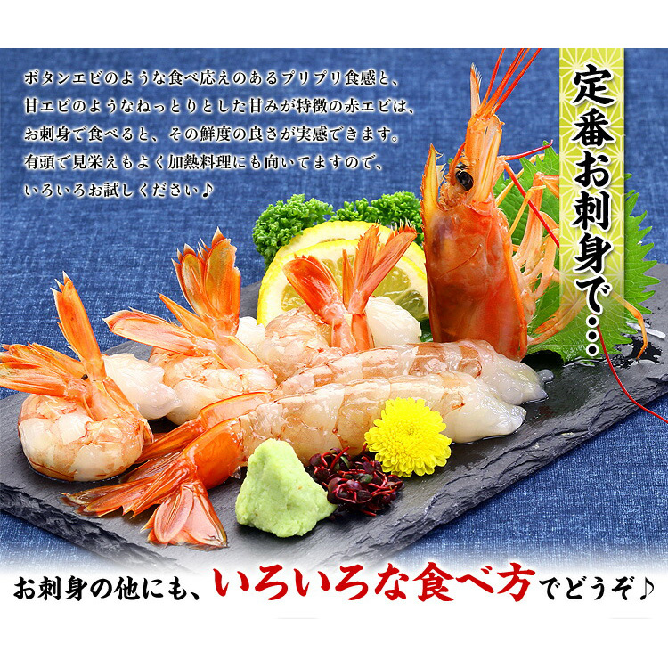 | 食べる直前に流水で急速解凍し、まずはお刺身でお召し上がり下さい。わさび醤油でエビの甘さと、とろけるような食感を十分にご堪能頂けます。お刺身の他にも、殻ごと塩焼き・空揚げ・薄味の旨煮などもお勧めですし、汁物、鍋物、茶碗蒸しなど、いろんなお料理にご利用頂けます。残った頭は捨てずに味噌汁に入れたり、唐揚げにしたり、パスタのソースに使うと絶品です♪ |