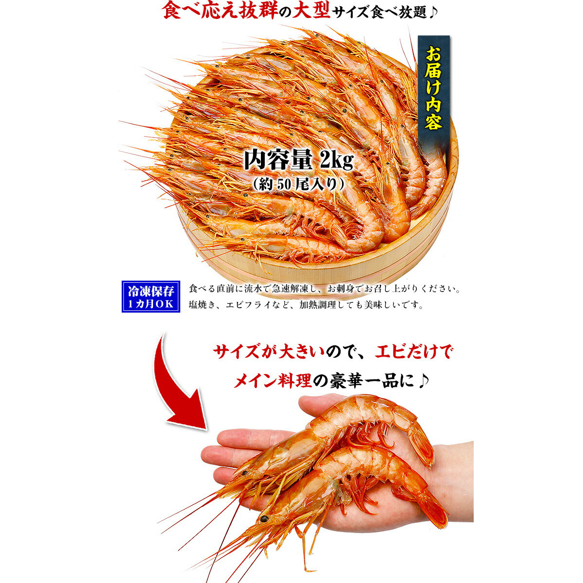 | ボタンエビのような食べ応えのあるプリプリ食感と、甘エビのようなねっとりした甘みが人気の赤エビをご紹介いたします!日本の真裏側にある国、アルゼンチンのサンホルヘ湾で漁獲されるこのエビは、とれたてを船上で急速凍結されるため鮮度がよく、お刺身用として近年、急激に流通が伸びています。その理由として、「他のエビに比べて安価」「鮮やかな赤色がきれい」「生食OK」「有頭なのでいろんな料理に使える」などがあります。また、2kgで約50尾入りという食べ応えのある大型サイズなので、小さい甘エビと比べると面倒な殻むきも簡単です。お刺身はもちろん、塩焼き、エビフライ…加熱料理にも向いているエビなので、色んな食べ方でお楽しみください♪ |