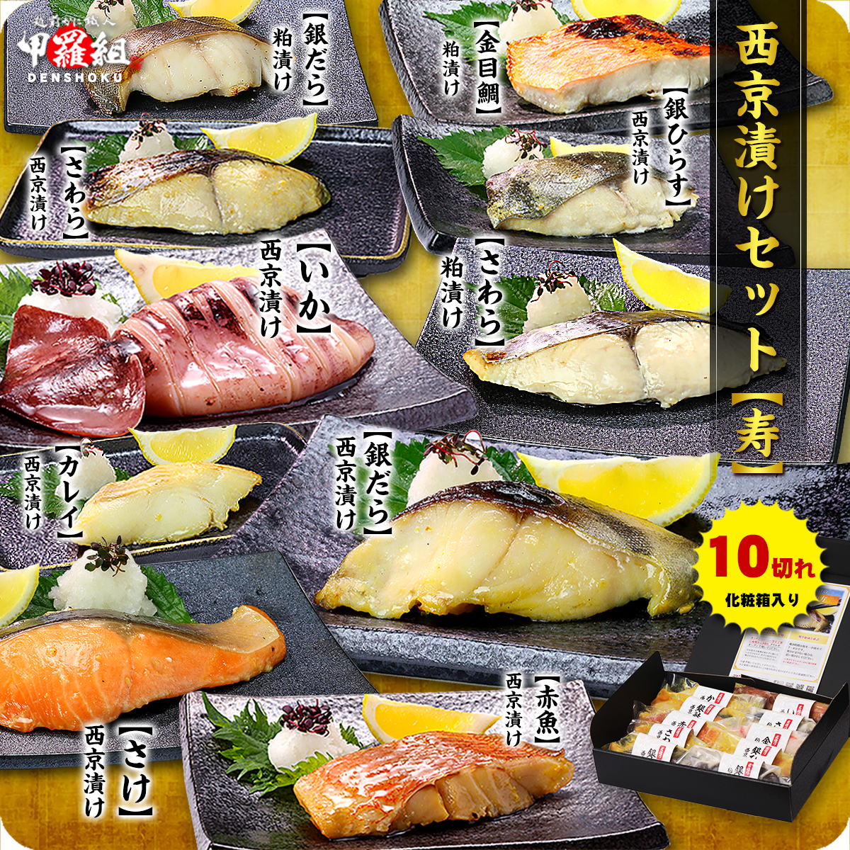 ◆西京漬け5切れセット【福】商品内容 【1】銀だら西京漬×1切れ約100g 銀だら(アメリカ産)、味噌、砂糖、甘酒、米発酵調味料、醸造酢、食塩、醤油、魚醤、清酒、ウコン末、食物繊維、酵母エキス、白キクラゲ抽出物/増粘剤(加工デンプン、キサンタン)、(一部に小麦・オレンジ・大豆を含む) 【2】さわら西京漬×1切れ約100g さわら(韓国産)、味噌、砂糖、甘酒、米発酵調味料、醸造酢、食塩、醤油、魚醤、清酒、ウコン末、食物繊維、酵母エキス、白キクラゲ抽出物/増粘剤(加工デンプン、キサンタン)、(一部に小麦・オレンジ・大豆を含む) 【3】 赤魚西京漬×1切れ約100g 赤魚(アメリカ産)、味噌、砂糖、甘酒、米発酵調味料、醸造酢、食塩、醤油、魚醤、清酒、ウコン末、食物繊維、酵母エキス、白キクラゲ抽出物/増粘剤(加工デンプン、キサンタン)、(一部に小麦・オレンジ・大豆を含む) 【4】さけ西京漬×1切れ約100g 銀サケ(チリ産)、味噌、砂糖、甘酒、米発酵調味料、醸造酢、食塩、醤油、魚醤、清酒、ウコン末、食物繊維、酵母エキス、白キクラゲ抽出物/増粘剤(加工デンプン、キサンタン)、(一部にさけ・小麦・オレンジ・大豆を含む) 【5】いか西京漬×1切れ約100g シルバーワレフ(チリ産)、味噌、砂糖、甘酒、米発酵調味料、醸造酢、食塩、醤油、魚醤、清酒、ウコン末、食物繊維、酵母エキス、白キクラゲ抽出物/増粘剤(加工デンプン、キサンタン)、(一部に小麦・オレンジ・大豆を含む) ◆西京漬け7切れセット【禄】商品内容 【1】銀だら西京漬×1切れ約100g 銀だら(アメリカ産)、味噌、砂糖、甘酒、米発酵調味料、醸造酢、食塩、醤油、魚醤、清酒、ウコン末、食物繊維、酵母エキス、白キクラゲ抽出物/増粘剤(加工デンプン、キサンタン)、(一部に小麦・オレンジ・大豆を含む) 【2】さわら西京漬×1切れ約100g さわら(韓国産)、味噌、砂糖、甘酒、米発酵調味料、醸造酢、食塩、醤油、魚醤、清酒、ウコン末、食物繊維、酵母エキス、白キクラゲ抽出物/増粘剤(加工デンプン、キサンタン)、(一部に小麦・オレンジ・大豆を含む) 【3】 赤魚西京漬×1切れ約100g 赤魚(アメリカ産)、味噌、砂糖、甘酒、米発酵調味料、醸造酢、食塩、醤油、魚醤、清酒、ウコン末、食物繊維、酵母エキス、白キクラゲ抽出物/増粘剤(加工デンプン、キサンタン)、(一部に小麦・オレンジ・大豆を含む) 【4】さけ西京漬×1切れ約100g 銀サケ(チリ産)、味噌、砂糖、甘酒、米発酵調味料、醸造酢、食塩、醤油、魚醤、清酒、ウコン末、食物繊維、酵母エキス、白キクラゲ抽出物/増粘剤(加工デンプン、キサンタン)、(一部にさけ・小麦・オレンジ・大豆を含む) 【5】いか西京漬×1切れ約100g シルバーワレフ(チリ産)、味噌、砂糖、甘酒、米発酵調味料、醸造酢、食塩、醤油、魚醤、清酒、ウコン末、食物繊維、酵母エキス、白キクラゲ抽出物/増粘剤(加工デンプン、キサンタン)、(一部に小麦・オレンジ・大豆を含む) 【6】銀だら粕漬×1切れ約100g 銀だら(アメリカ産)、酒粕、ぶどう糖果糖液糖、食塩、醸造酢/増粘多糖類 【7】さわら粕漬×1切れ約100g さわら(韓国産)、酒粕、ぶどう糖果糖液糖、食塩、醸造酢/増粘多糖類 ◆西京漬け10切れセット【寿】商品内容 【1】銀だら西京漬×1切れ約100g 銀だら(アメリカ産)、味噌、砂糖、甘酒、米発酵調味料、醸造酢、食塩、醤油、魚醤、清酒、ウコン末、食物繊維、酵母エキス、白キクラゲ抽出物/増粘剤(加工デンプン、キサンタン)、(一部に小麦・オレンジ・大豆を含む) 【2】さわら西京漬×1切れ約100g さわら(韓国産)、味噌、砂糖、甘酒、米発酵調味料、醸造酢、食塩、醤油、魚醤、清酒、ウコン末、食物繊維、酵母エキス、白キクラゲ抽出物/増粘剤(加工デンプン、キサンタン)、(一部に小麦・オレンジ・大豆を含む) 【3】 赤魚西京漬×1切れ約100g 赤魚(アメリカ産)、味噌、砂糖、甘酒、米発酵調味料、醸造酢、食塩、醤油、魚醤、清酒、ウコン末、食物繊維、酵母エキス、白キクラゲ抽出物/増粘剤(加工デンプン、キサンタン)、(一部に小麦・オレンジ・大豆を含む) 【4】さけ西京漬×1切れ約100g 銀サケ(チリ産)、味噌、砂糖、甘酒、米発酵調味料、醸造酢、食塩、醤油、魚醤、清酒、ウコン末、食物繊維、酵母エキス、白キクラゲ抽出物/増粘剤(加工デンプン、キサンタン)、(一部にさけ・小麦・オレンジ・大豆を含む) 【5】いか西京漬×1切れ約100g シルバーワレフ(チリ産)、味噌、砂糖、甘酒、米発酵調味料、醸造酢、食塩、醤油、魚醤、清酒、ウコン末、食物繊維、酵母エキス、白キクラゲ抽出物/増粘剤(加工デンプン、キサンタン)、(一部に小麦・オレンジ・大豆を含む) 【6】銀だら粕漬×1切れ約100g 銀だら(アメリカ産)、酒粕、ぶどう糖果糖液糖、食塩、醸造酢/増粘多糖類 【7】さわら粕漬×1切れ約100g さわら(韓国産)、酒粕、ぶどう糖果糖液糖、食塩、醸造酢/増粘多糖類 【8】銀ひらす西京漬×1切れ約100g シルバーワレフ(チリ産)、味噌、砂糖、甘酒、米発酵調味料、醸造酢、食塩、醤油、魚醤、清酒、ウコン末、食物繊維