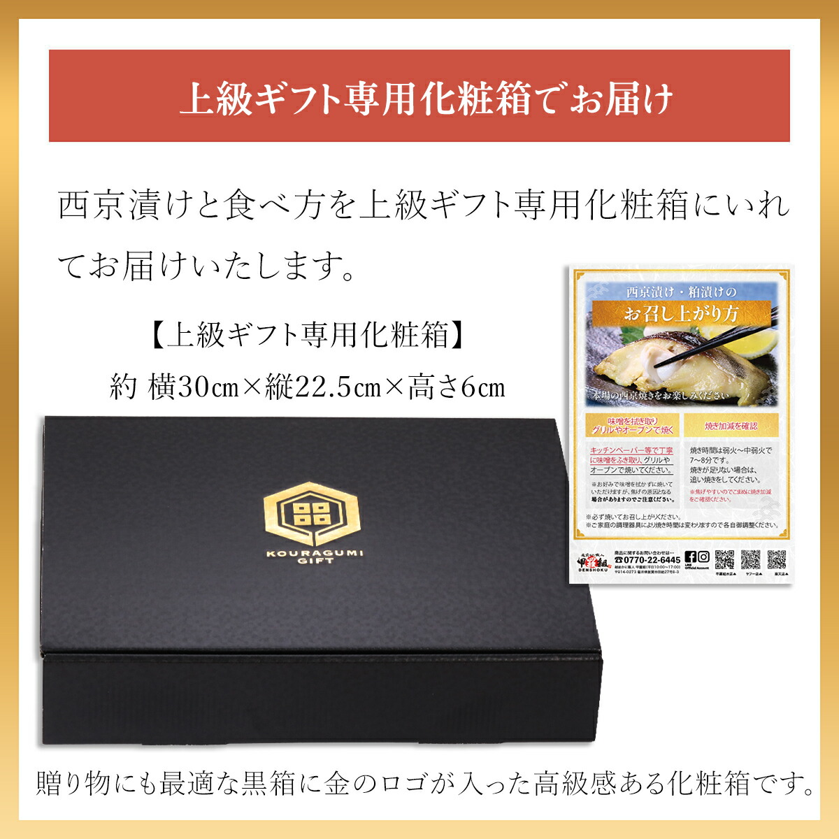 ◎高級銀ダラやサワラなどが入った本格西京漬け&粕漬けセット! ◎本場京都の西京味噌を使用し、じっくり72時間漬け込みます! ◎しっとり柔らかく、繊細で上品な味わいは高級料亭の味! ◎1切れずつ個包装なので、ご自宅用はもちろんギフトにもお薦め! ◎ご飯のお伴、酒の肴、お茶漬けやおにぎりの具、お弁当に♪ 焼き上がる芳醇な香り…。旨みを何倍にも引き出す複雑で深い味わいは、まさに大人の美食。脂のり抜群の漬魚の王道「銀ダラ」をはじめ、しっとり柔らか上品な甘みが特徴の「金目鯛」、そして定番の「サワラ」や「サケ」など、鮮度の良い上質な切身を厳選した豪華な西京漬けセットです。使用する味噌は、本場京都の西京味噌。塩分を少なく上品な味で丹精込めて漬け込みました。焼きたてを温かいご飯と一緒に食べると、まるで高級料亭のような贅沢な気分を味わえます。また、冷て柔らかく美味しいのでメイン料理の他にも、おにぎりやお茶漬けの具、お弁当にもお薦めです。1切れずつ個包装になっており、食べ方の説明書も同封いたしますので、ご自宅用はもちろんギフトにも安心してご利用下さいませ。