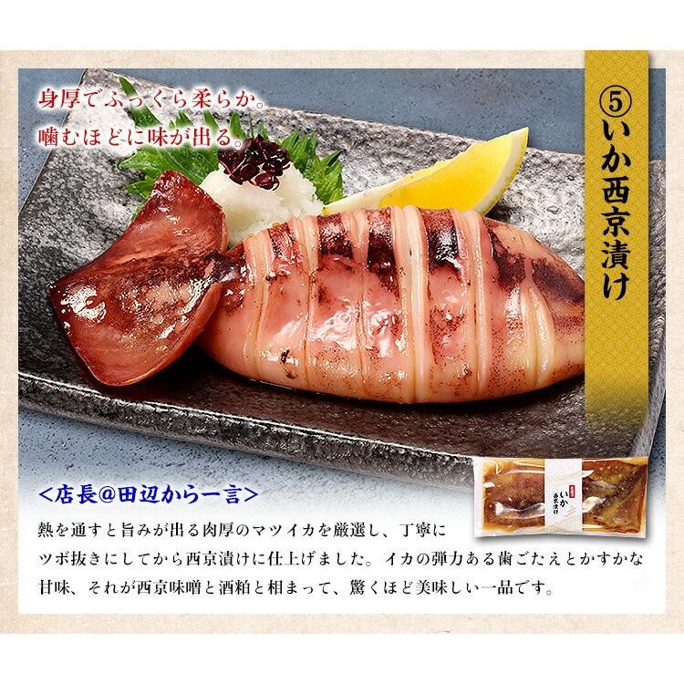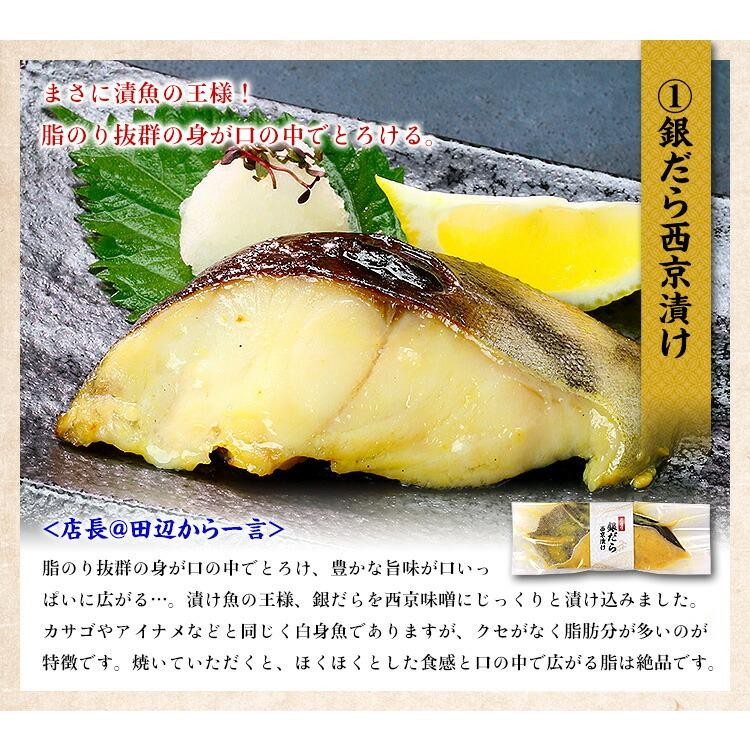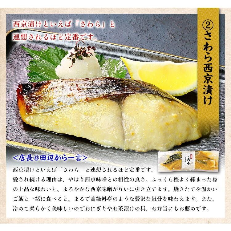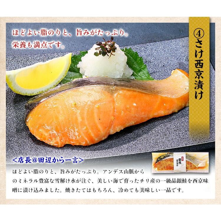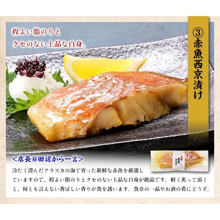 ◆西京漬け5切れセット【福】商品内容 【1】銀だら西京漬×1切れ約100g 銀だら(アメリカ産)、味噌、砂糖、甘酒、米発酵調味料、醸造酢、食塩、醤油、魚醤、清酒、ウコン末、食物繊維、酵母エキス、白キクラゲ抽出物/増粘剤(加工デンプン、キサンタン)、(一部に小麦・オレンジ・大豆を含む) 【2】さわら西京漬×1切れ約100g さわら(韓国産)、味噌、砂糖、甘酒、米発酵調味料、醸造酢、食塩、醤油、魚醤、清酒、ウコン末、食物繊維、酵母エキス、白キクラゲ抽出物/増粘剤(加工デンプン、キサンタン)、(一部に小麦・オレンジ・大豆を含む) 【3】 赤魚西京漬×1切れ約100g 赤魚(アメリカ産)、味噌、砂糖、甘酒、米発酵調味料、醸造酢、食塩、醤油、魚醤、清酒、ウコン末、食物繊維、酵母エキス、白キクラゲ抽出物/増粘剤(加工デンプン、キサンタン)、(一部に小麦・オレンジ・大豆を含む) 【4】さけ西京漬×1切れ約100g 銀サケ(チリ産)、味噌、砂糖、甘酒、米発酵調味料、醸造酢、食塩、醤油、魚醤、清酒、ウコン末、食物繊維、酵母エキス、白キクラゲ抽出物/増粘剤(加工デンプン、キサンタン)、(一部にさけ・小麦・オレンジ・大豆を含む) 【5】いか西京漬×1切れ約100g シルバーワレフ(チリ産)、味噌、砂糖、甘酒、米発酵調味料、醸造酢、食塩、醤油、魚醤、清酒、ウコン末、食物繊維、酵母エキス、白キクラゲ抽出物/増粘剤(加工デンプン、キサンタン)、(一部に小麦・オレンジ・大豆を含む) ◆西京漬け7切れセット【禄】商品内容 【1】銀だら西京漬×1切れ約100g 銀だら(アメリカ産)、味噌、砂糖、甘酒、米発酵調味料、醸造酢、食塩、醤油、魚醤、清酒、ウコン末、食物繊維、酵母エキス、白キクラゲ抽出物/増粘剤(加工デンプン、キサンタン)、(一部に小麦・オレンジ・大豆を含む) 【2】さわら西京漬×1切れ約100g さわら(韓国産)、味噌、砂糖、甘酒、米発酵調味料、醸造酢、食塩、醤油、魚醤、清酒、ウコン末、食物繊維、酵母エキス、白キクラゲ抽出物/増粘剤(加工デンプン、キサンタン)、(一部に小麦・オレンジ・大豆を含む) 【3】 赤魚西京漬×1切れ約100g 赤魚(アメリカ産)、味噌、砂糖、甘酒、米発酵調味料、醸造酢、食塩、醤油、魚醤、清酒、ウコン末、食物繊維、酵母エキス、白キクラゲ抽出物/増粘剤(加工デンプン、キサンタン)、(一部に小麦・オレンジ・大豆を含む) 【4】さけ西京漬×1切れ約100g 銀サケ(チリ産)、味噌、砂糖、甘酒、米発酵調味料、醸造酢、食塩、醤油、魚醤、清酒、ウコン末、食物繊維、酵母エキス、白キクラゲ抽出物/増粘剤(加工デンプン、キサンタン)、(一部にさけ・小麦・オレンジ・大豆を含む) 【5】いか西京漬×1切れ約100g シルバーワレフ(チリ産)、味噌、砂糖、甘酒、米発酵調味料、醸造酢、食塩、醤油、魚醤、清酒、ウコン末、食物繊維、酵母エキス、白キクラゲ抽出物/増粘剤(加工デンプン、キサンタン)、(一部に小麦・オレンジ・大豆を含む) 【6】銀だら粕漬×1切れ約100g 銀だら(アメリカ産)、酒粕、ぶどう糖果糖液糖、食塩、醸造酢/増粘多糖類 【7】さわら粕漬×1切れ約100g さわら(韓国産)、酒粕、ぶどう糖果糖液糖、食塩、醸造酢/増粘多糖類 ◆西京漬け10切れセット【寿】商品内容 【1】銀だら西京漬×1切れ約100g 銀だら(アメリカ産)、味噌、砂糖、甘酒、米発酵調味料、醸造酢、食塩、醤油、魚醤、清酒、ウコン末、食物繊維、酵母エキス、白キクラゲ抽出物/増粘剤(加工デンプン、キサンタン)、(一部に小麦・オレンジ・大豆を含む) 【2】さわら西京漬×1切れ約100g さわら(韓国産)、味噌、砂糖、甘酒、米発酵調味料、醸造酢、食塩、醤油、魚醤、清酒、ウコン末、食物繊維、酵母エキス、白キクラゲ抽出物/増粘剤(加工デンプン、キサンタン)、(一部に小麦・オレンジ・大豆を含む) 【3】 赤魚西京漬×1切れ約100g 赤魚(アメリカ産)、味噌、砂糖、甘酒、米発酵調味料、醸造酢、食塩、醤油、魚醤、清酒、ウコン末、食物繊維、酵母エキス、白キクラゲ抽出物/増粘剤(加工デンプン、キサンタン)、(一部に小麦・オレンジ・大豆を含む) 【4】さけ西京漬×1切れ約100g 銀サケ(チリ産)、味噌、砂糖、甘酒、米発酵調味料、醸造酢、食塩、醤油、魚醤、清酒、ウコン末、食物繊維、酵母エキス、白キクラゲ抽出物/増粘剤(加工デンプン、キサンタン)、(一部にさけ・小麦・オレンジ・大豆を含む) 【5】いか西京漬×1切れ約100g シルバーワレフ(チリ産)、味噌、砂糖、甘酒、米発酵調味料、醸造酢、食塩、醤油、魚醤、清酒、ウコン末、食物繊維、酵母エキス、白キクラゲ抽出物/増粘剤(加工デンプン、キサンタン)、(一部に小麦・オレンジ・大豆を含む) 【6】銀だら粕漬×1切れ約100g 銀だら(アメリカ産)、酒粕、ぶどう糖果糖液糖、食塩、醸造酢/増粘多糖類 【7】さわら粕漬×1切れ約100g さわら(韓国産)、酒粕、ぶどう糖果糖液糖、食塩、醸造酢/増粘多糖類 【8】銀ひらす西京漬×1切れ約100g シルバーワレフ(チリ産)、味噌、砂糖、甘酒、米発酵調味料、醸造酢、食塩、醤油、魚醤、清酒、ウコン末、食物繊維