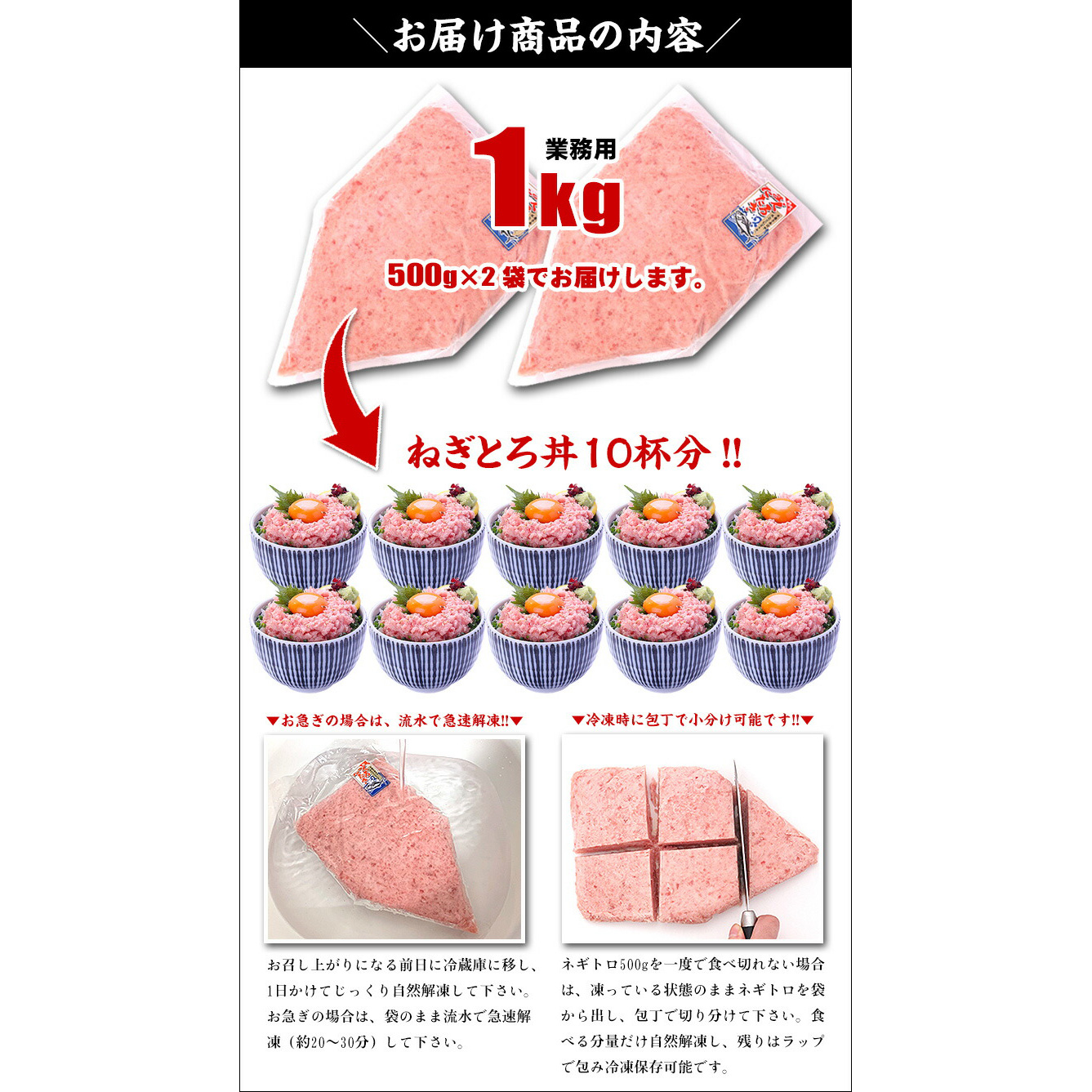| ねぎとろ(まぐろたたき)1kg(500g×2袋) 原材料:まぐろ(台湾、日本、その他)、食用油脂/pH調整剤、トレハロース、酸化防止剤(V.C) |
