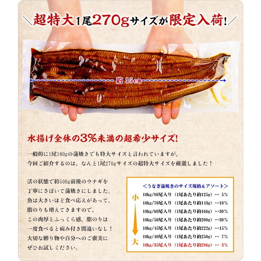 ウナギ生産量日本一の南九州より、漁獲量が少ない超特大サイズが限定入荷!一般的に1尾180gの蒲焼きでも特大サイズと言われていますが、今回ご紹介するのは、なんと1尾270g前後の超特大サイズ!ふっくら肉厚で食べ応えのあるブランド鰻をぜひお試しください!大隅半島は日本のフロリダと呼ばれるほど温暖な気候で、火山灰度の地下水は殺菌力のある弱酸性でミネラルも豊富に含まれており、水温も20℃前後で一年中安定しています。この水の恵みを最大限に生かし、自然の生育環境に近い状態で育てることで、美味しいウナギが育つのです。池揚げされたウナギは熟練の職人により丁寧にさばかれて、すぐさま蒲焼きの工程に入ります。蒸してから白焼きにしたウナギに、秘伝の焼きタレを付けては焼くという工程を3回繰り返すことで、ふっくらとして香ばしい風味に仕上げてあります。焼きあがったウナギは、美味しさを保つためにすぐさま真空包装&急速凍結されますので、冷凍保存1ヶ月OK。湯せんor電子レンジで調理も簡単です。ご家庭で手軽に専門店の味がご堪能いただけます。