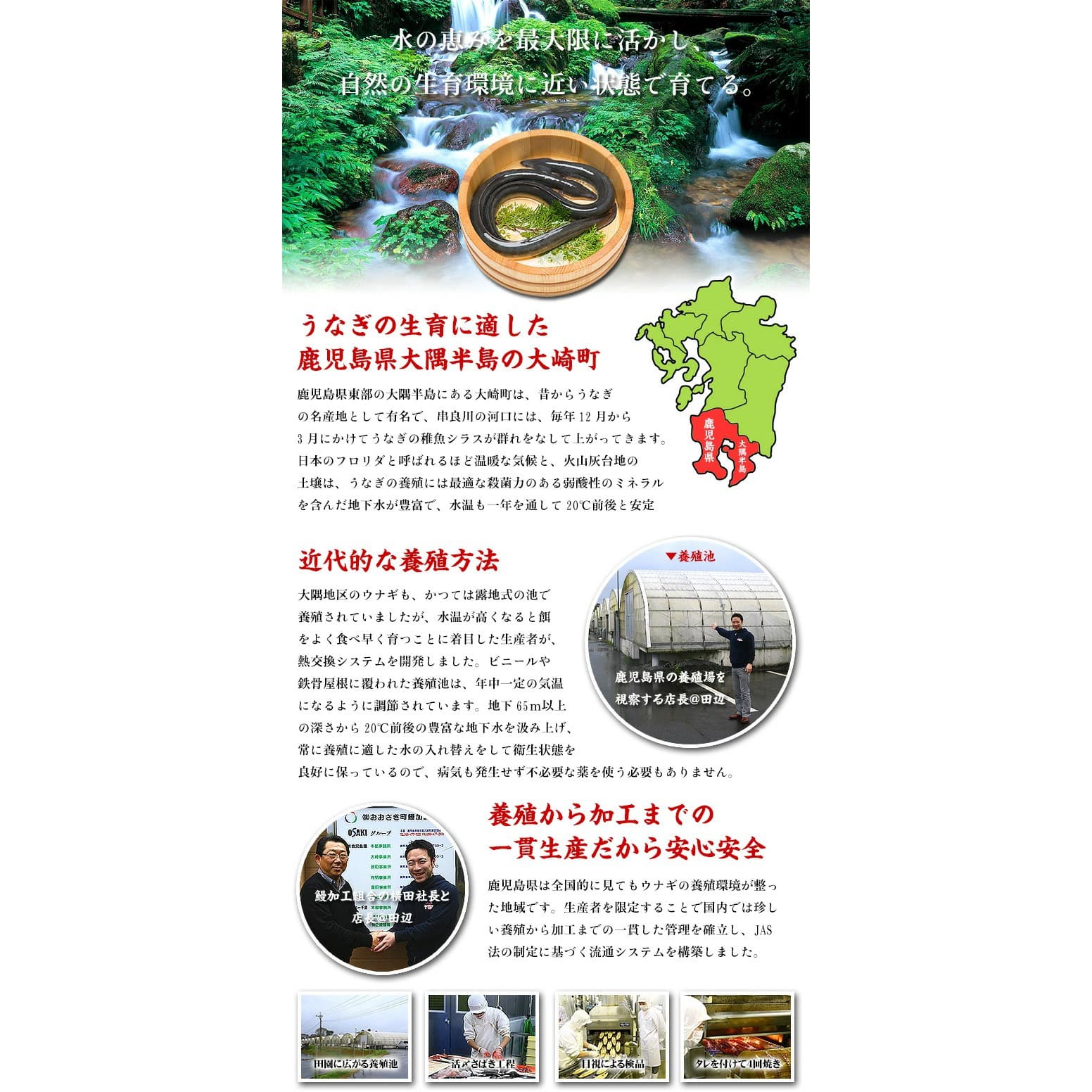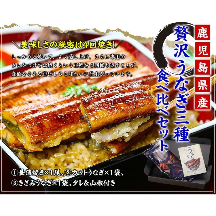 | うなぎ生産量日本一の鹿児島県大崎町で育てられた安心安全のこだわりうなぎをご紹介!極上の「長蒲焼き」と食べやすくカットした「カットうなぎ」と「きざみうなぎ」の贅沢な詰め合わせです。おいしさの秘密は「焼き」と「蒸し」の加工にあります。しっかりと焼いて、よく蒸し上げ、さらに専用のタレをつけては焼くという工程を4回繰り返すことで、食欲をそそる香ばしさと味わいに仕上がります。脂ののった肉厚の極上うなぎを一度お試しくださいませ。 |