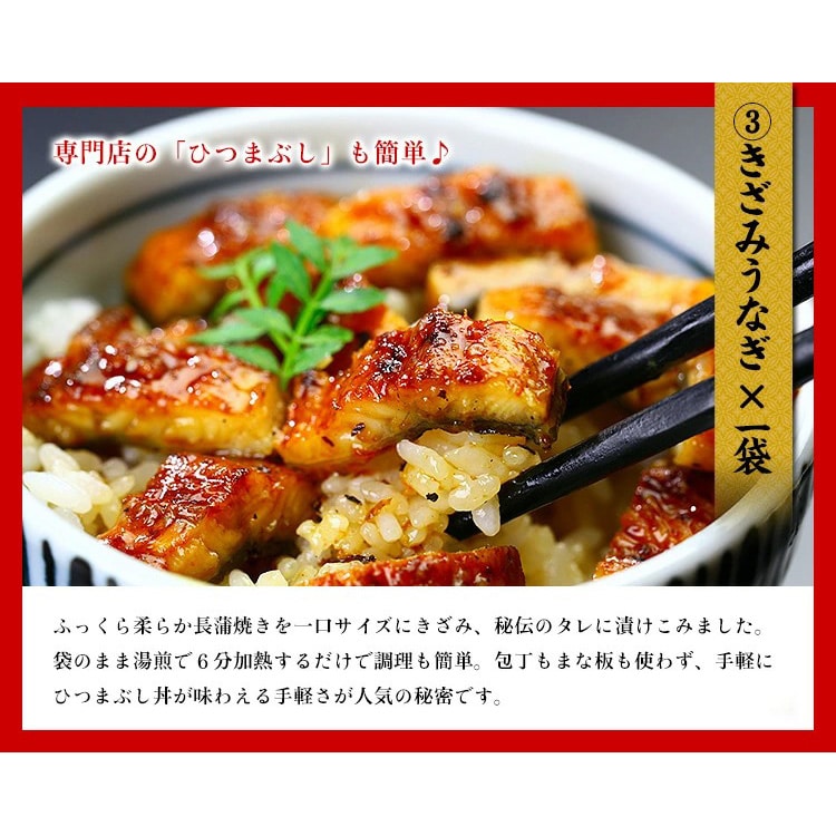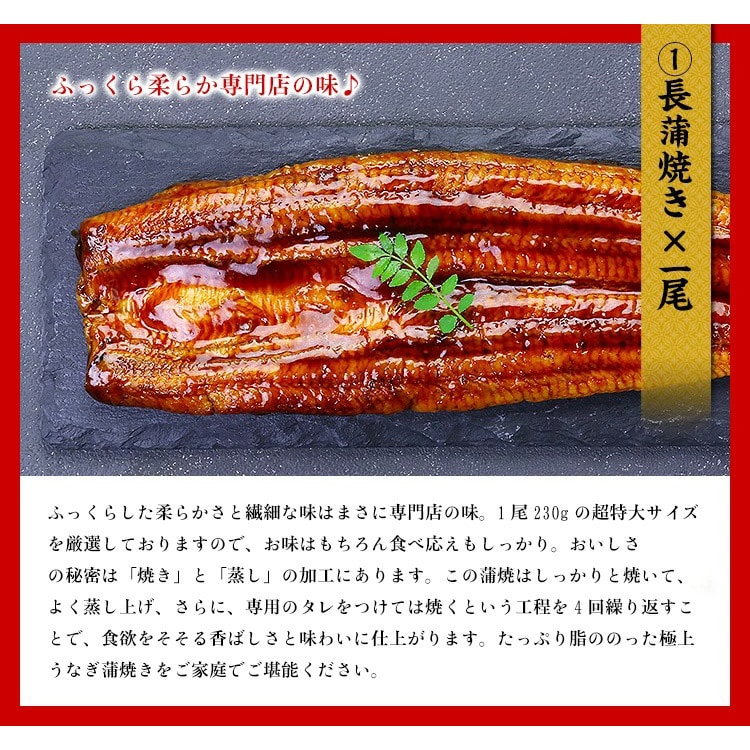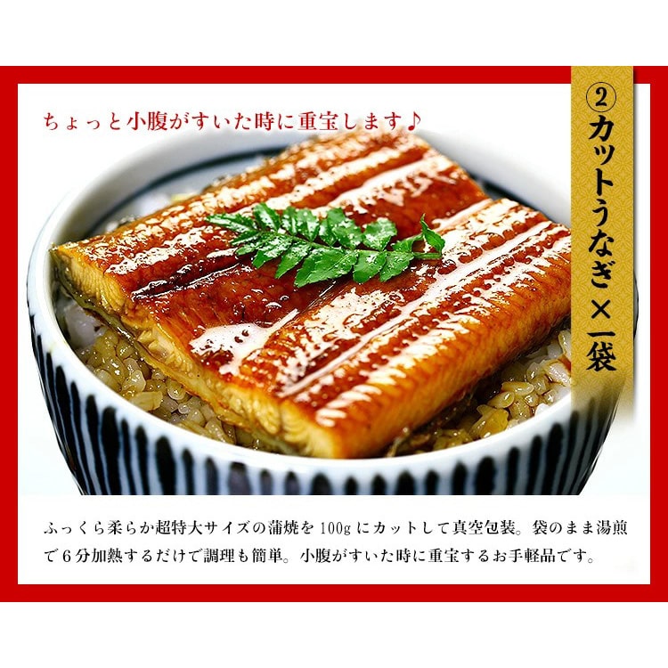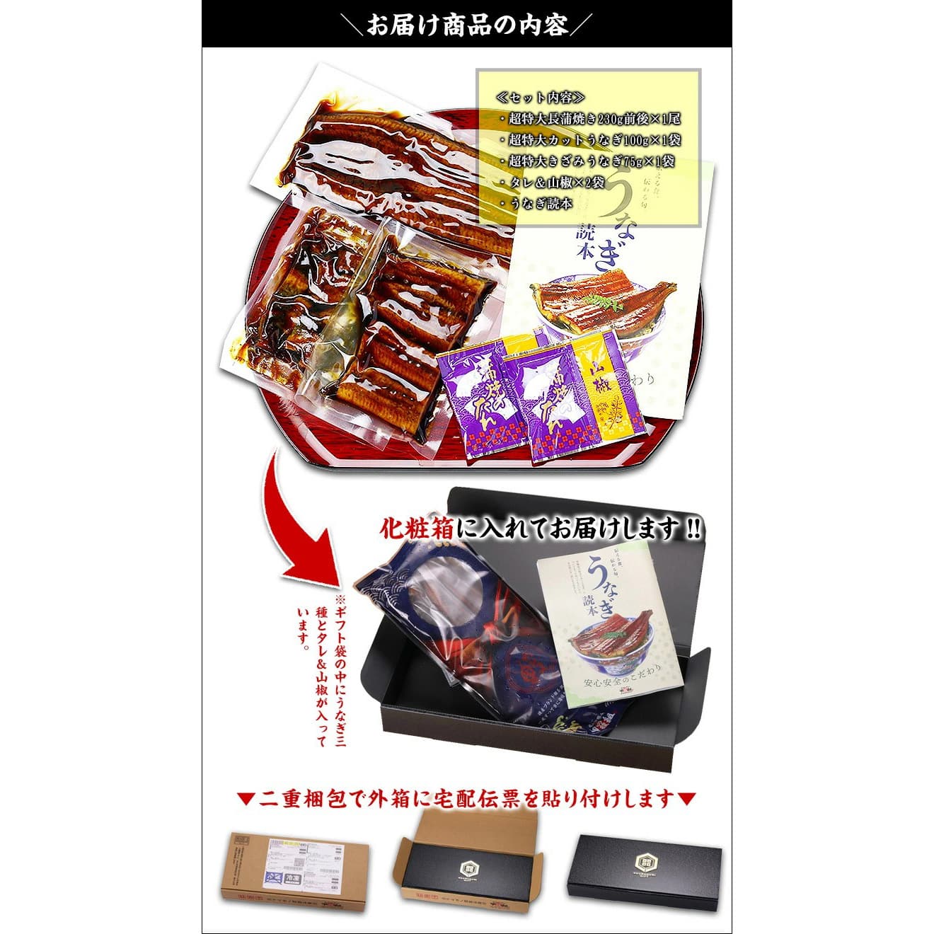 | 超特大サイズ長蒲焼き220g×1枚、超特大カットうなぎ蒲焼き100g×1袋、超特大きざみうなぎ蒲焼き75g×1袋、蒲焼きのタレ&山椒、食べ方の説明書同封 |