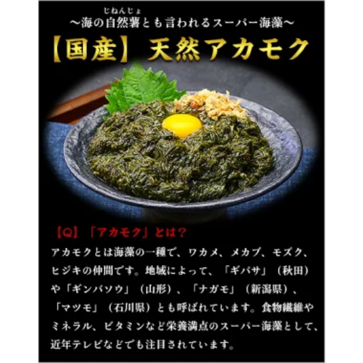 | ◎食物繊維やミネラル、ビタミンなど栄養満点! ◎安心安全の国産天然アカモクを無添加&無着色加工! ◎業務用だからボリューム満点でお得!たっぷり500g食べ放題! ◎癖がなくいろんな料理に合うのもアカモクの魅力! アカモクとは海藻の一種で、ワカメ、メカブ、モズク、ヒジキの仲間です。地域によって、「ギバサ」(秋田)や「ギンバソウ」(山形)、「ナガモ」(新潟県)、「マツモ」(石川県)とも呼ばれています。長いものは2~3ヶ月で7~8mに達する、強い生命力を持った海藻です。古くから栄養価の高い海藻として重用され、日本では、大和時代から食されており、万葉集では「玉藻」と詠まれ、当時の「美」の代名詞でした。またアカモクに多くついている気泡(浮袋)が稲穂を連想させ、縁起物として伊勢神宮にも毎年奉納されています。アカモクは、食物繊維やミネラル、ビタミンなど栄養満点で、健康成分たっぷりのスーパー海藻として、近年テレビなどでも注目されています。「アカモク」の名の通り、海に生きている時は赤色(褐色)でそれをボイルすることで鮮やかな緑色へと変化します。今回お届けするのは、一番美味しい旬の時期に漁獲した新鮮なアカモクをボイル後に細かく刻み、無添加&無着色のまま真空パック急速冷凍した一級品です。旬の時期を過ぎたものや、内容量を増やすために水で増量した二級品と比べると、ふんわり香る磯の風味や粘り気の違いは歴然です。 |