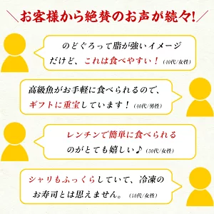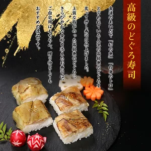 ★高級魚「のどぐろ」使用のお寿司が登場! ★秘伝の甘酢と生姜を混ぜた酢飯がのどぐろと相性バッチリ♪ ★独自の冷凍技術で素材の細胞を傷つけず美味しさそのまま! ★煌びやかな金粉で見た目も豪華♪ ★冷凍保存&電子レンジ解凍で保存・調理もカンタン! のどぐろ」は正式名称「赤ムツ」と言われていますが、口を開けて中を覗くと喉のあたりが黒いため、北陸地方では通称「のどぐろ」と呼ばれ流通しています。 東北・北陸以南・日本海・太平洋に広く分布していますが、漁獲量が少ないため一般の市場に出回る機会が少なく、幻の魚の異名を持っています。 またのどぐろは一年を通して脂のりが良く、濃厚な甘みを感じさせてくれる柔らかな肉質で、「白身のトロ」とも呼ばれるほど脂が強い魚です。 その為、当店では程よい大きさにスライスしたのどぐろを炙り、秘伝の甘酢や生姜を混ぜた酢飯と共にお寿司に仕上げることで、素材の旨味を引き立てつつ、脂の強さに負けることのない、食べやすいお寿司に仕上げました。 見た目に豪華な金粉もつけて化粧箱でお届けしますので、ご自宅用はもちろん、ギフトなどでもご利用ください♪ |