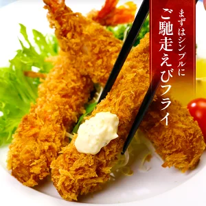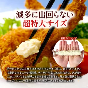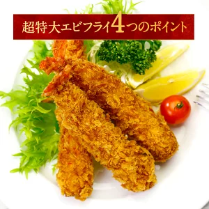 | 超特大6L 大エビフライ10尾(5尾×2パック) ※産地:インドネシア・ベトナム 原材料:えび、食塩、衣(パン粉、小麦粉、鶏卵粉、砂糖、パーム油、食塩、でん粉、粉末状植物性たん白)、加工でん粉、調味料(アミノ酸)、ベーキングパウダー、焼成Ca、pH調整剤、香辛料抽出物、(原材料の一部に大豆を含む) |