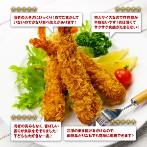 | ◎超特大「6Lサイズ」のブラックタイガーを厳選! ◎ボリューム満点!食べ応え抜群! ◎1尾ずつ丁寧に衣付けしているので、衣が薄い! ◎冷凍保存で使いたい分だけ調理可能! ◎晩ごはんの一品、お弁当におすすめです! 超特大「6Lサイズ」のブラックタイガーを厳選。 手付けで衣を薄く付けているので、よくある「衣だけ!」 のえびフライとは違います! 希少な大型サイズを厳選しているので、食べ応え抜群! 冷凍保管が可能なので、使いたいときに使いたい分だけ 取り出して揚げるだけ!というお手軽さも人気の秘密です♪ |