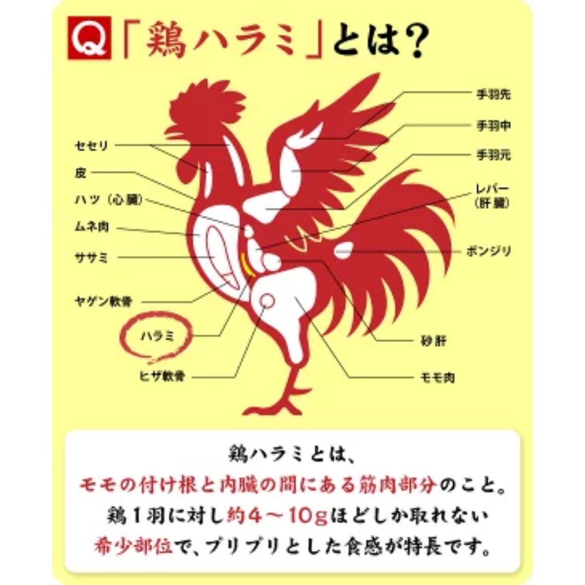 | 鶏ハラミとは、モモの付け根と内臓の間にある筋肉部分のこと。鶏1羽に対し約4‐10gほどしか取れない希少部位で、プリプリとした食感が特長です。そんな鶏ハラミを炭火で香ばしく焼き上げることで、食べた時にしっかりと炭火の風味を感じられます。また電子レンジで簡単調理できるので、手軽に鶏ハラミの炭火焼をご堪能いただけます♪ お弁当にもおつまみにもぴったりの鶏ハラミ炭火焼を是非ご賞味ください。 |