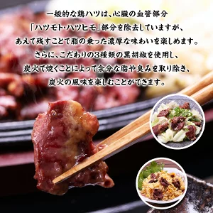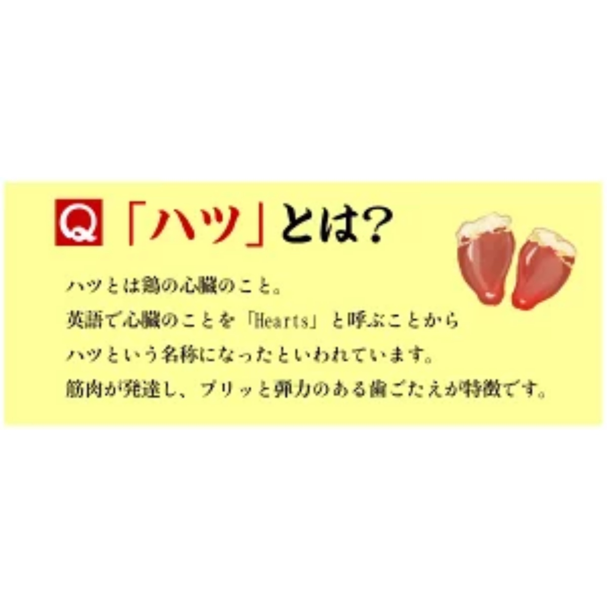 | ハツとは鶏の心臓のこと。英語で心臓のことを「Hearts」と呼ぶことからハツという名称になったといわれています。筋肉が発達し、プリッと弾力のある歯ごたえが特徴です。 一般的な鶏ハツは、心臓の血管部分「ハツモト・ハツヒモ」部分を除去していますが、あえて残すことで脂の乗った濃厚な味わいを楽しめます。 さらに、こだわりの3種類の黒胡椒を使用し、炭火で焼くことによって余分な脂や臭みを取り除き、炭火の風味を楽しむことができます。 |