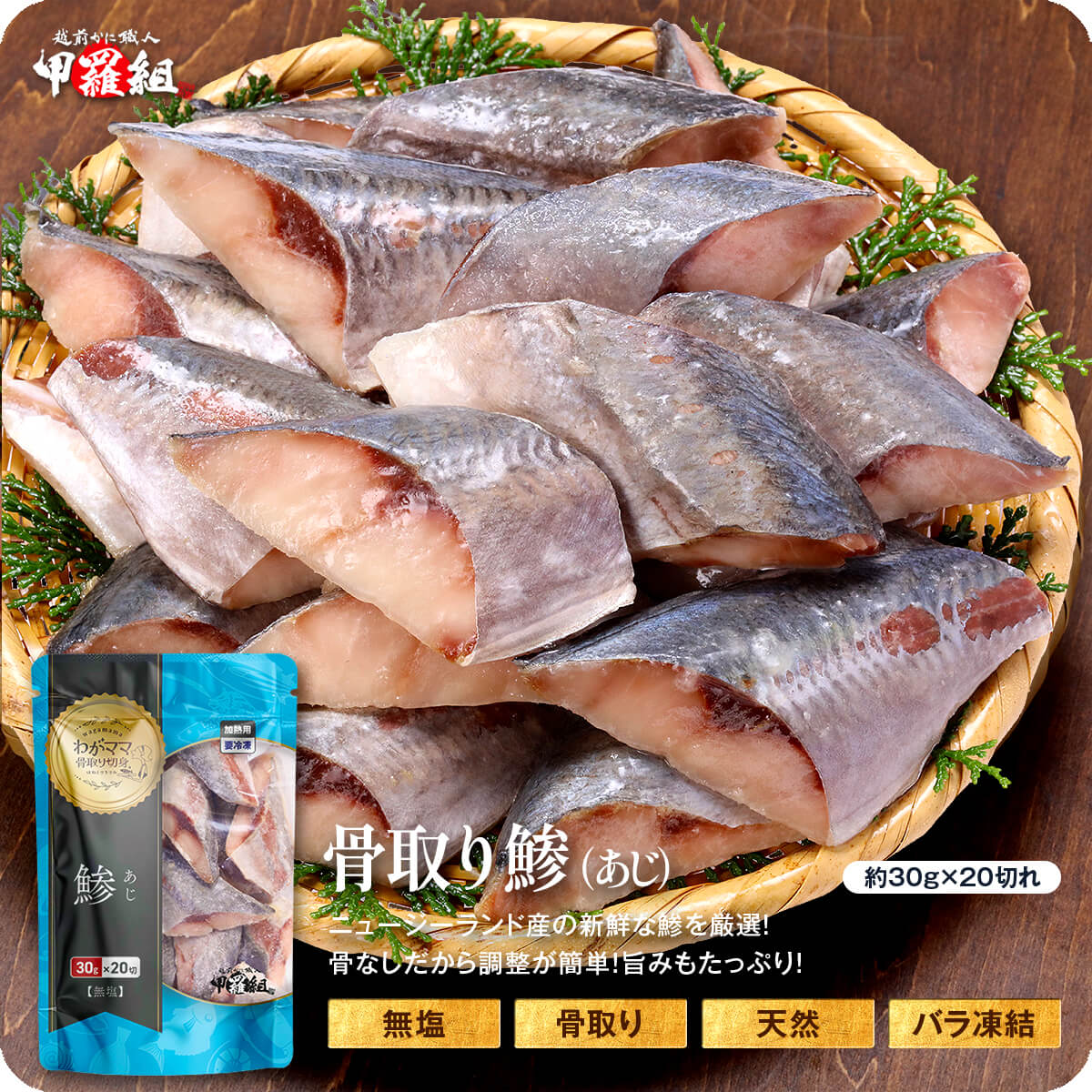 | 無塩&骨取りアジの切身(約30g×20切れ・約60g×10切れ) 原材料:アジ(ニュージーランド産) |