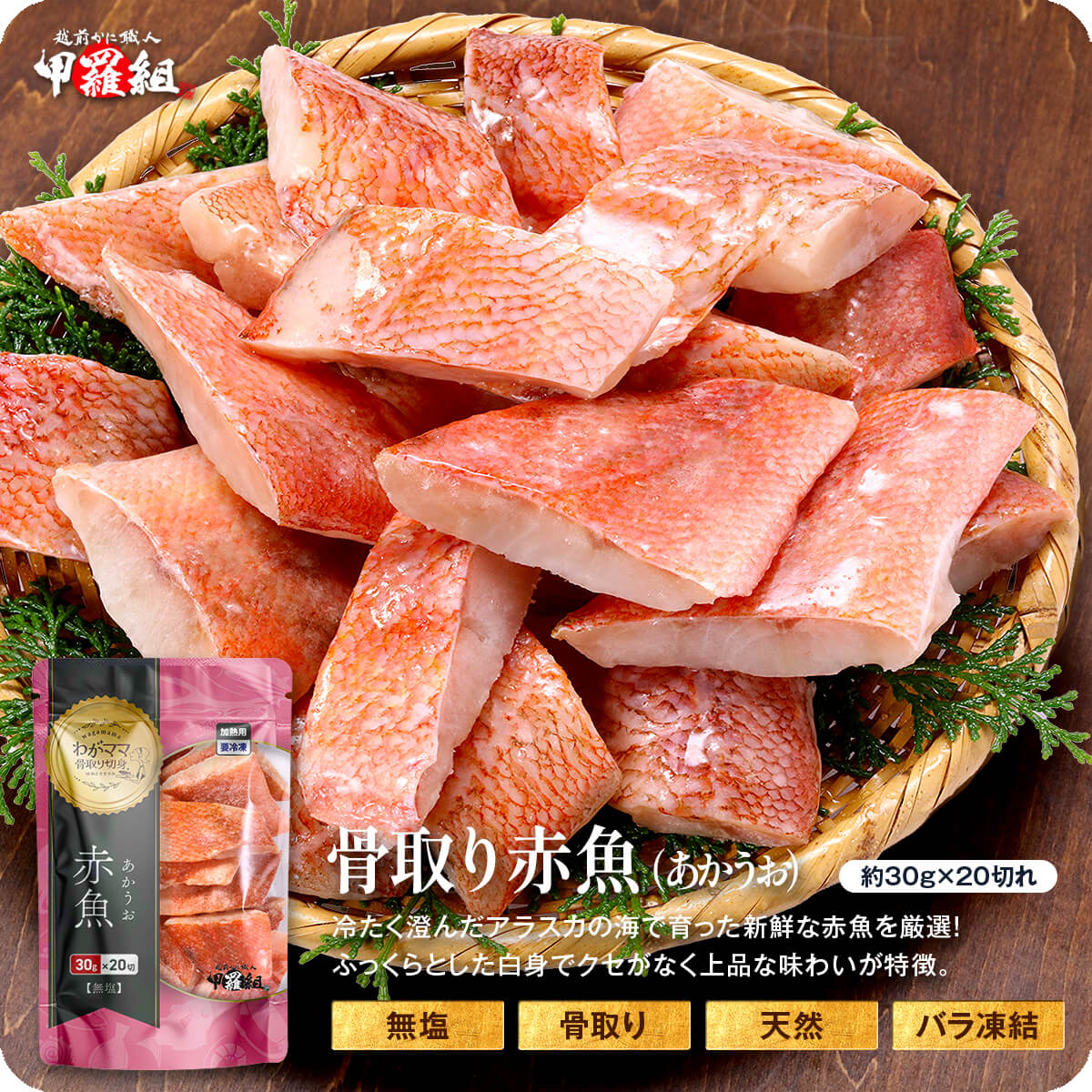 | 無塩&骨取り赤魚の切身(約30g×20切れ/約60g×10切れ) 原材料:赤魚(アメリカ産)/酸化防止剤(V.C)) |