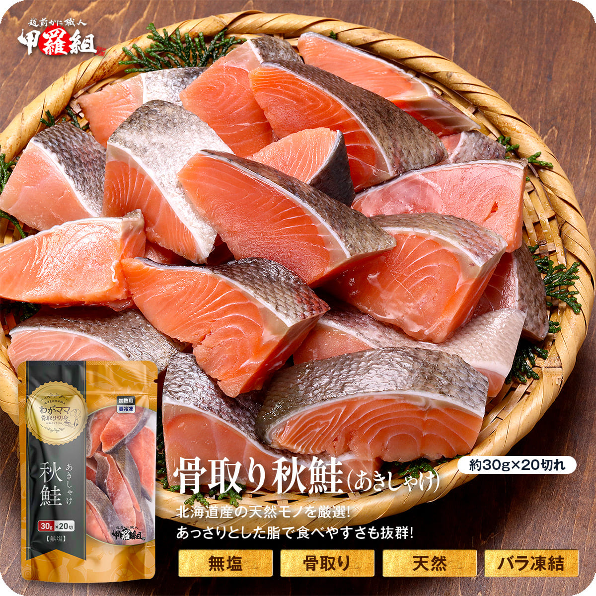 | 無塩&骨取り秋鮭の切身(約30g×20切れ)(約60g×10切れ) 原材料:サケ(北海道産)/酸化防止剤(V.C) ※北海道産の秋鮭をベトナムの工場で切身にして骨取り加工しています。 |