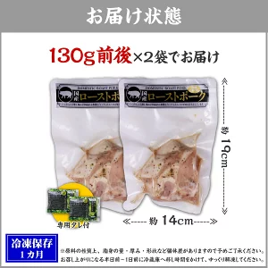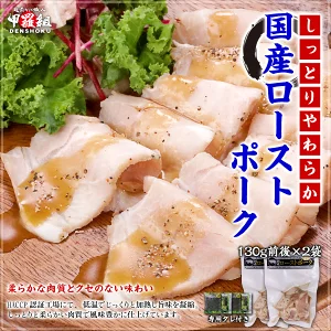 | ローストポーク 130g前後×2袋 <原材料>豚肉(国産)、食塩、香辛料、粉末醤油、蛋白加水分解物、チキンエキス/調味料(アミノ酸等)、(一部に小麦・乳成分・大豆・鶏肉・豚肉・ごまを含む) |