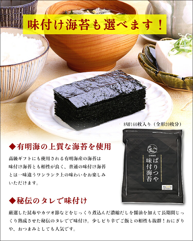 | ◎名産地「有明海」の上質の早摘み海苔を厳選! ◎遠赤外線でパリっと焼き上げ色艶やかで風味抜群! ◎風味そのまま真空パックに入れて新鮮直送! ◎手巻き寿司やおにぎり、軍艦巻きなどいろんな食べ方で! ◎「プレミアム20枚」or「訳あり30枚」or「プレミアム味付8切160枚」「国産焼き海苔40枚」4種類から選べる! 「スーパーと比べて美味しい!」「食べても食べても無くならない大ボリュームが嬉しい!」「3歳の孫もおやつ代わりにパリパリ食べてます(^^)」などなど、絶賛のお声が続々。 日本有数の海苔の名産地「有明海」で早期に採れた上質の海苔を厳選。遠赤外線でパリっと焼き上げて、真空パックでお届けします。九州の一級河川である筑後川が流れ込む栄養豊かな汽水域で、 最大6メートルにもなる潮の干満差を活用した独自の栽培方法が、その美味しさの秘密です。うま味あふれる口どけのよい有明海苔は、味、香り、歯切れ、柔らかさ、どれを取っても文句無しの一級品です。 |