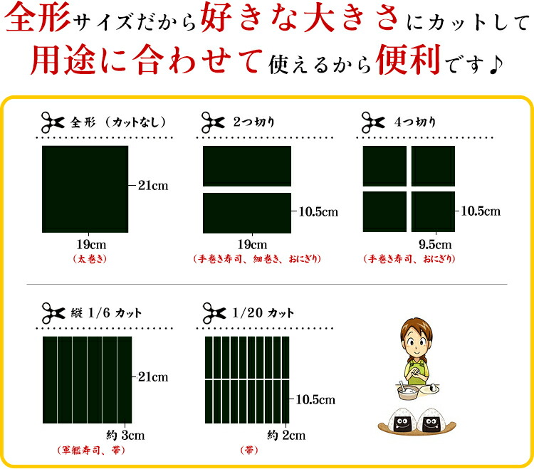 おにぎりや太巻き、手巻き寿司、軍艦巻き、具材の帯など、いろんなお料理にご利用いただけます。 |