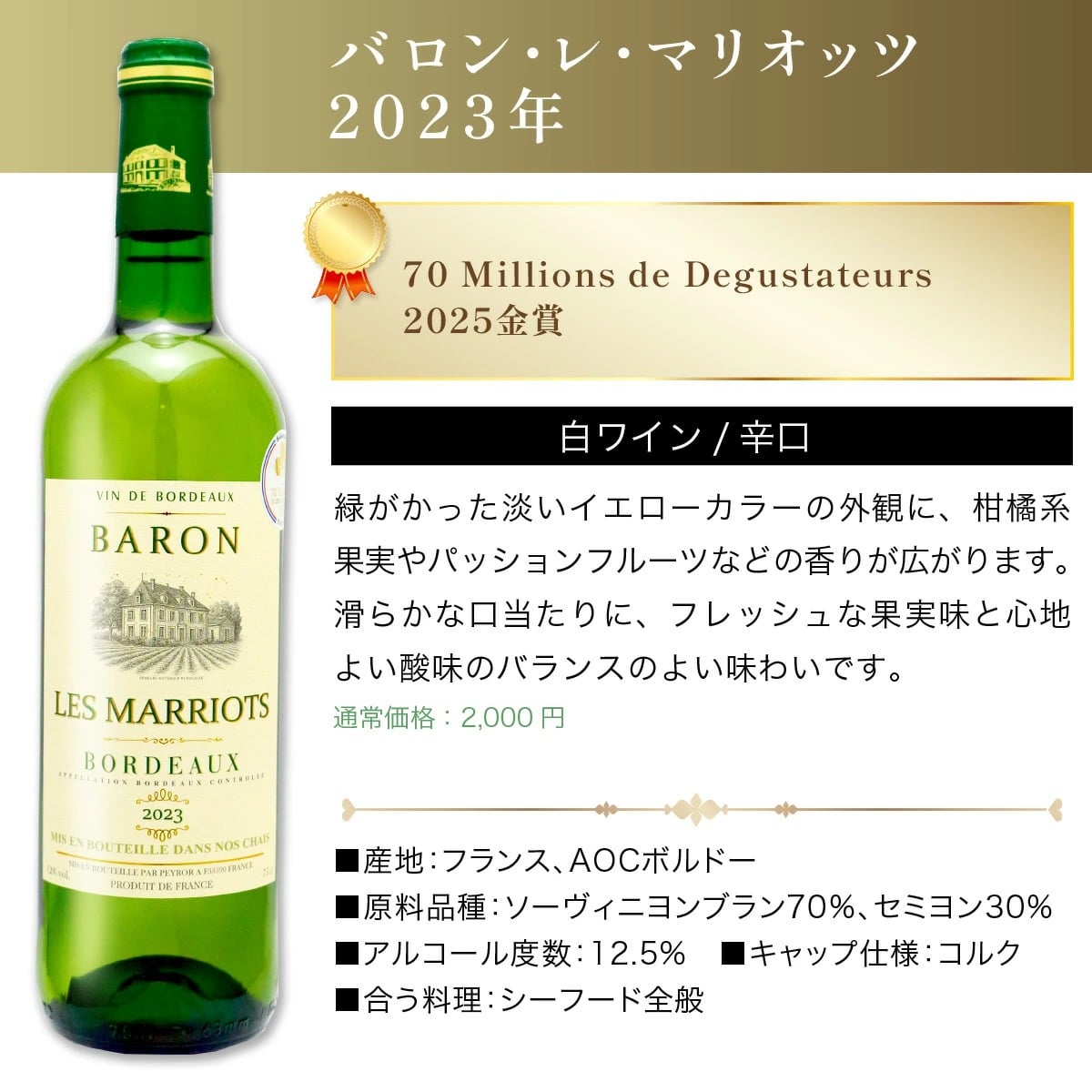 (Baron Les Marriots) 【産地】フランス、AOCボルドー 【色・味わい】白ワイン/辛口 【品種】ソーヴィニヨンブラン70%、セミヨン30% 【Alc】12.5% 【ペアリング】シーフード全般 【コンクール】 70Millions de Degustateurs2025金賞 【キャップ仕様】コルク |