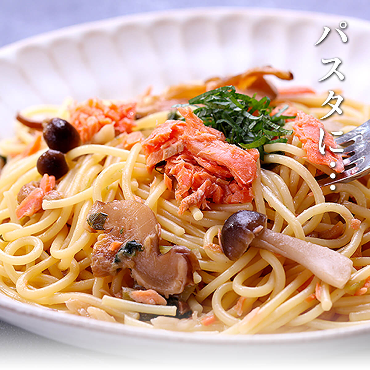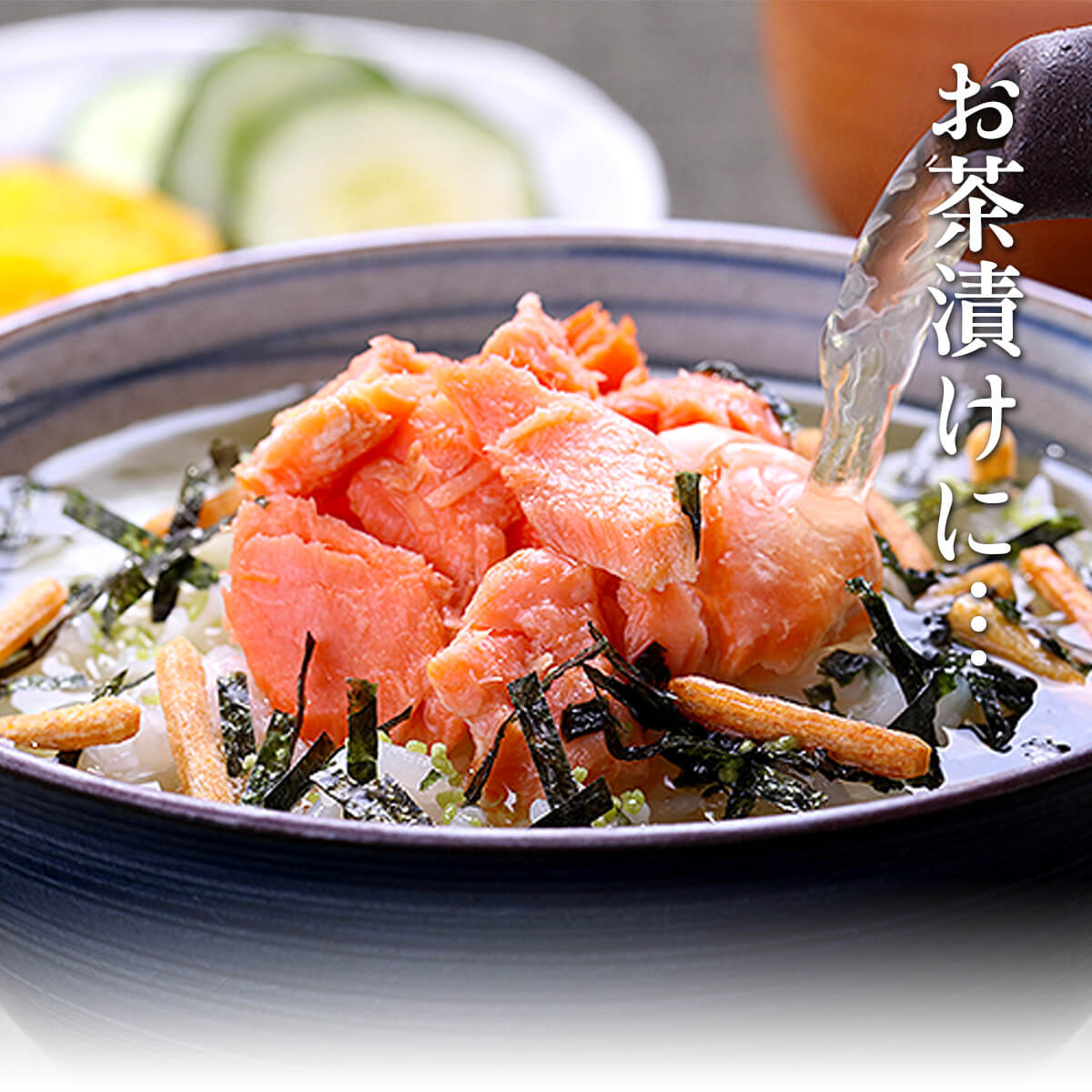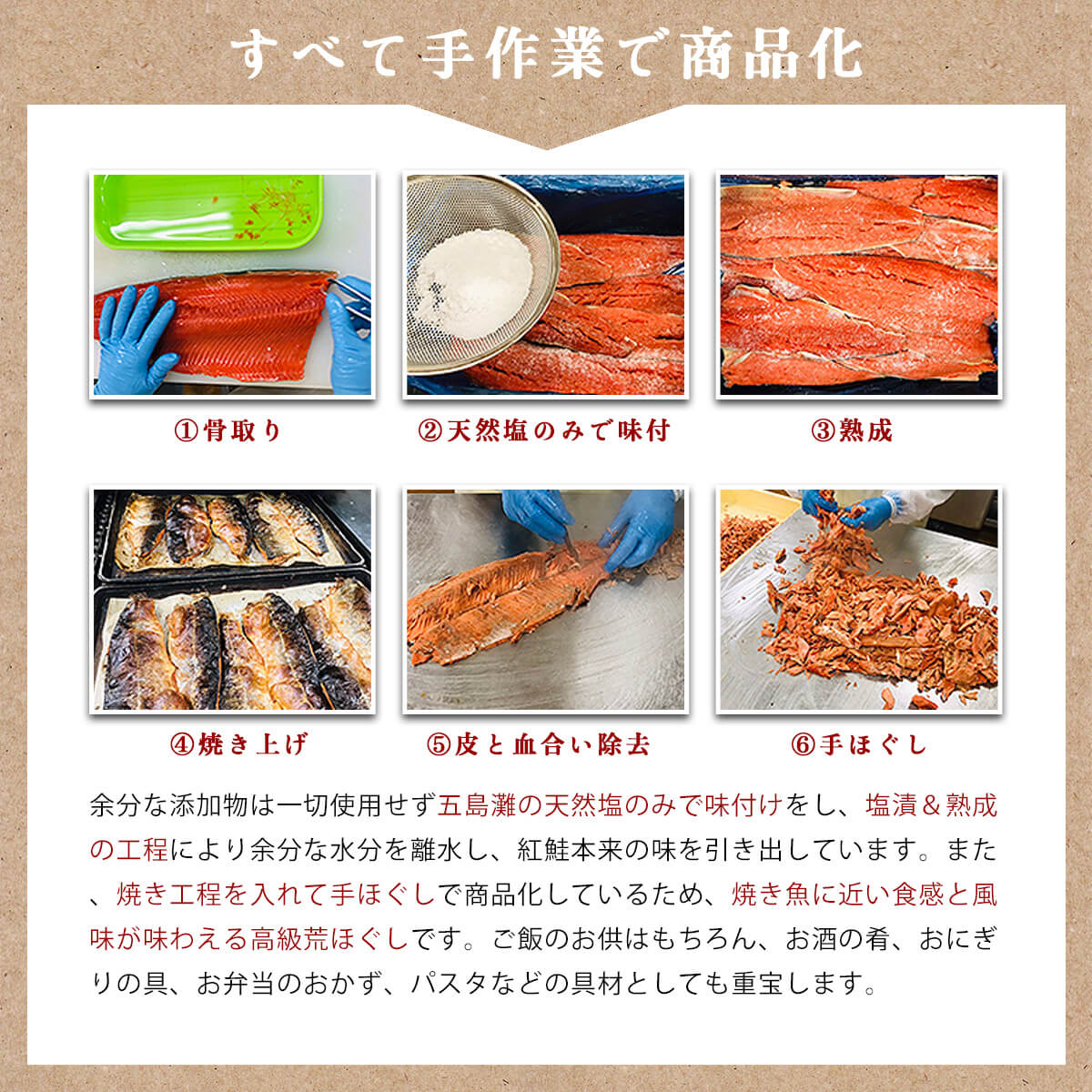 | 一口に「鮭」といっても、白鮭や銀鮭、アトランティックサーモン、トラウトサーモンなど、いろんな種類がありますが、今回ご紹介するのは鮭の中でも旨みが強く希少とされる天然紅鮭です。養殖のできない紅鮭は鮭類の中で最高の味を誇り、目にも鮮やかな真紅の身色を呈し肉質もしっかりしています。養殖の魚との最大の違いは、身に張りがあり、臭みが無く、冷めても堅くなりません。中からにじみ出てくるような旨味のある脂が特徴です。さらに栄養分(ミネラルやビタミン)が豊富に含まれることです。余分な添加物は一切使用せず五島灘の天然塩のみで味付けをし、塩漬&熟成の工程により余分な水分を離水し、紅鮭本来の味を引き出しています。また、焼き工程を入れて手ほぐしで製品化しているため、焼き魚に近い食感と風味が味わえる高級荒ほぐしです。ご飯のお供はもちろん、お酒の肴、おにぎりの具、お弁当のおかず、パスタなどの具材としても重宝します。 |