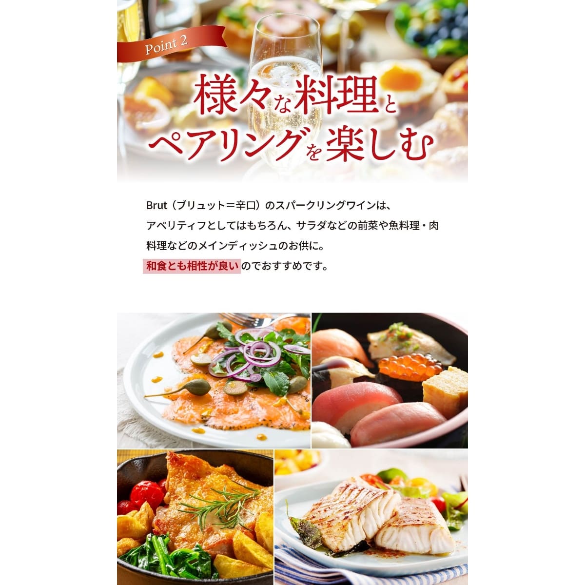 緑がかった淡いゴールドカラーの美しい外観に、白い果実のアロマに花のニュアンスを感じる華やかな香り。 持続性のある泡立ちに、フレッシュな果実味と爽やかな酸味のバランスの良い、ドライで辛口の味わいです。 |