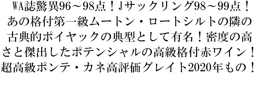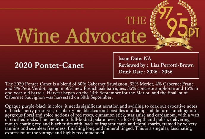 シャトー・ランシュ・バージュほどまろやかな厚みはないかもしれないが、高貴さで勝るポンテ・カネはシャトー・ピション・ロングヴィルの優雅さと独特の風情にまで達することもある。近年のヴィンテージは全て密度の高さとポテンシャルが傑出している。』とル・クラスマン誌も激賞し5大シャトーに次ぐダブルスター★★評価。