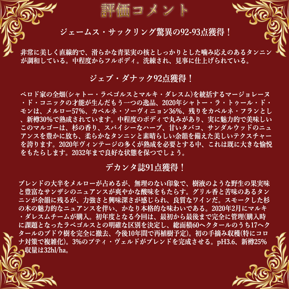 熟したベリーと西洋スギ、バニラなどの素晴らしい香りと、鉄や土の香りもあり、抜群のバランスを誇る!ボルドー通にも大人気の究極マルゴー!すばらしい魅力に富んだ熟成と共に卓越さを示す長命のワイン!高級マルゴー・ブルジョワ級のグレイトヴィンテージ[2020]年がこのプライスは最高です!インポーターさんとの協賛プライスで限定で少量入荷!