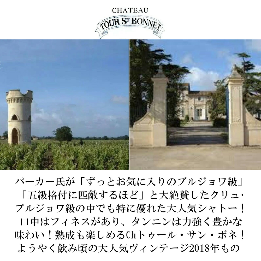 ロバート・パーカー氏をして、「トゥール・サン・ボネは前から、ずっと私のお気に入りのブルジョワ級である」と言わしめ、「しなやかですぐ飲める商業的につくられたブルジョワ級ではなく、深みのある色で引き締まったタニックなフルボディのワインで驚くべき凝縮感がある。」!