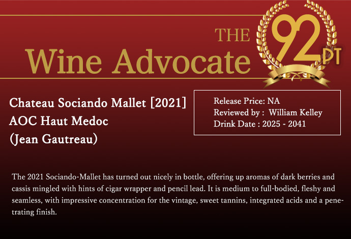 2021年のシャトー・ソシアンド・マレは、メドック・グラン・クリュ格付けと同等の評価を受ける大人気のオー・メドックワインだ。ミディアムからフルボディで、明るく凝縮感のある果実味と、ピリッとした酸、長く塩味のあるフィニッシュが特徴的だ。アロマはダーク・ベリー、甘草、シガー・ラッパー、ローム質の土壌を感じさせる。味わいはピュアでジューシー、ストロベリー、ラズベリー、レッドチェリーなどの鮮やかな赤い果実と、砕いた石のエッジがミネラルの質感と風味を与えている。完璧なエレガンスとフィネスを持ち、2021年ヴィンテージの特徴をよく表現している。暗く魅惑的な美しさを持つこのワインは、将来的に多くを語るポテンシャルを秘めている。格付シャトーに匹敵する実力を持つと評価され、独立独歩の地位を確立したシャトー・ソシアンド・マレの力量が存分に発揮された一本だ。