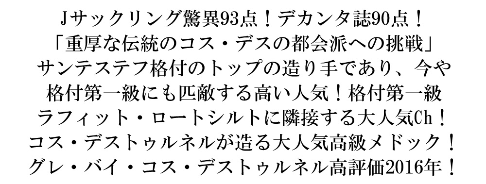 深く、濃く、豊かな果実味、プラムからベリーまで。フルボディで層があり、濃厚で非常にリッチ。2022年以降がベスト。」!デカンタ誌90点でコメントは「これは素晴らしいグレで、美しくフレッシュなメドックの冷涼なエッジと寛大さが相まっている。私が試飲したグレの中で、間違いなく最高の1本である。火打ち石とスモークのアロマが鼻に抜け、赤い果実の香りがボディに広がる。