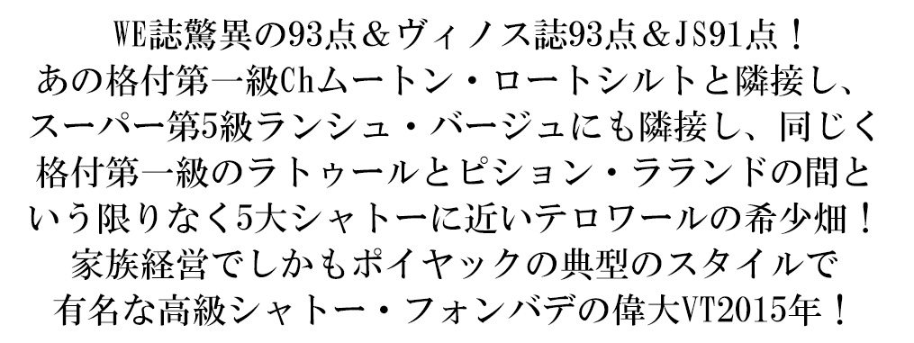 世紀のヴィンテージ!ボルドーのグレイトヴィンテージ!各誌大絶賛の[2015]年もの(WAでポイヤックに93点&RVF誌でも97点を付けるスペシャルヴィンテージ)の大人気ヴィンテージ!