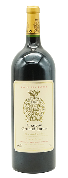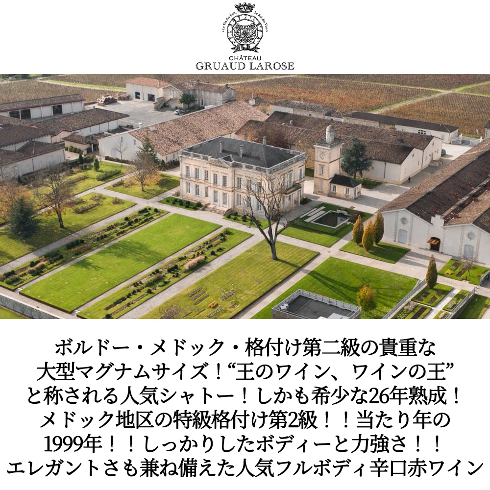 高級メドック格付フルボディ赤ワイン愛好家大注目!サンジュリアン格付ファン大注目!しかも貴重な大型マグナムサイズ!しかも希少な飲み頃、26年熟成品!格付第一級に次ぐ、メドック格付第二級!(エチケットに堂々と「王のワイン、ワインの王」と記されているとおり、1855年の格付け当時、第一級シャトーに次いで取引価格が高かったと言われるグリュオ・ラローズ。"王のワイン、ワインの王"(“LE VIN DES ROIS LE ROI DES VINS”)と称される人気シャトー。ボルドー、メドック地区の特級格付け第2級!!当たり年の1999年!!しっかりしたボディーと力強さ!!エレガントさも兼ね備えています!! 「現在でも愛されている第2級格付けのひとつ」と称されています。)しかもサン・ジュリアンはポイヤックとマルゴーに挟まれた土地柄、両者の中庸的なスタイルと説明されることが多いですが、そのサン・ジュリアンの美点を余すところなく表現しているのがこのシャトーです。(ポイヤック的な堅牢で重厚なスタイルと、マルゴー的な優雅さやフィネス、それらを調和のとれたスタイルに落ち着かせる熟練の技が生きた品格のあるワインがこのグリュオー・ラローズ)また、第二級シャトーの中で最大級の生産量を誇り、年によって品質にムラがなく、安心して買えるというのも魅力です。しかもボルドーの隠れた良年・グレイトヴィンテージと言われる1999年もの(1999年は、非常に暑い年でした。造り手にとっては決して平坦ではありませんでしたが、収穫量が多くブドウが十分に熟していたおかげで、穏やかな酸となめらかな飲み口のワインが造られました。早熟で豊作の年となった1999年ヴィンテージ。8月20日から9月初めの数日間は好天に恵まれ、ブドウは順調に成熟。 グラン・クリュにとっては非常に良いヴィンテージとなりました。ただ時間のかかる年であったため評価もまちまちですが非常に堅牢で強靭な味わいは、年月とともにほどけ、現在非常に良い状態になっています。)フランスワイン評価誌ル・メイユール・ヴァン・ド・フランス(旧クラスマン)は「愛すべきこのシャトーはボルドーでもトップクラスの最高レベルを取り戻している」と大絶賛し、5大シャトーに次ぐ★★ダブルスター評価!ロバート・パーカー氏は★★★3つ星生産者に挙げ、ゴーミヨ誌2014年度版でも★★★★★5つ星!ヒュー・ジョンソン氏は「最も愛されている第2級格付のひとつ」と高評価し、5大シャトーなどと同じ最高評価4つ星獲得!カベルネ・ソーヴィニョン61%、メルロー31%、プティ・ヴェルド(4%)カベルネ・フラン(3%)マルベック(1%)で造られる究極辛口フルボディ赤ワイン!シャトー・シャス・スプリーンやシャトー・フェリエール、シャトー・シトラン等の所有者でもある、メルロー家(ボルドー指折りタイヤングループ)の所有で人気も品質も急上昇!の大人気サンジュリアン格付(メドック格付第2級)の飲み頃、26年熟成!しかも大型マグナムサイズ!の大人気ヴィンテージが限定で極少量入荷!