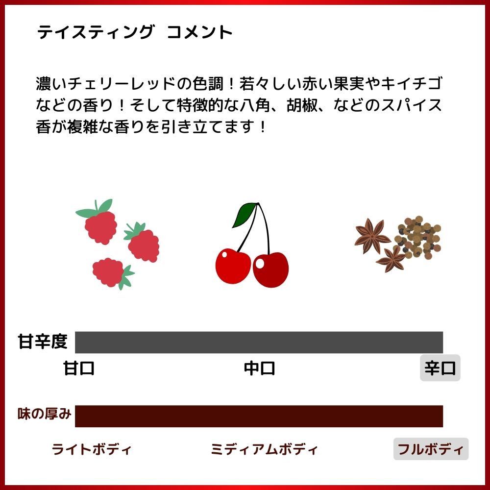 メルロー、カベルネ・ソーヴィニヨン、カベルネ・フランをオーク樽熟成で造られるこのワインは、濃いチェリーレッドの色調!若々しい赤い果実やキイチゴなどの香り!そして特徴的な八角、胡椒、などのスパイス香が複雑な香りを引き立てます!